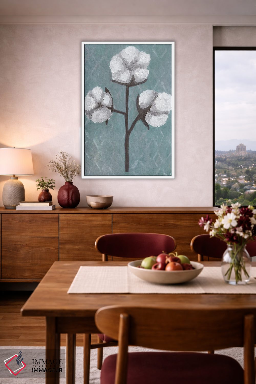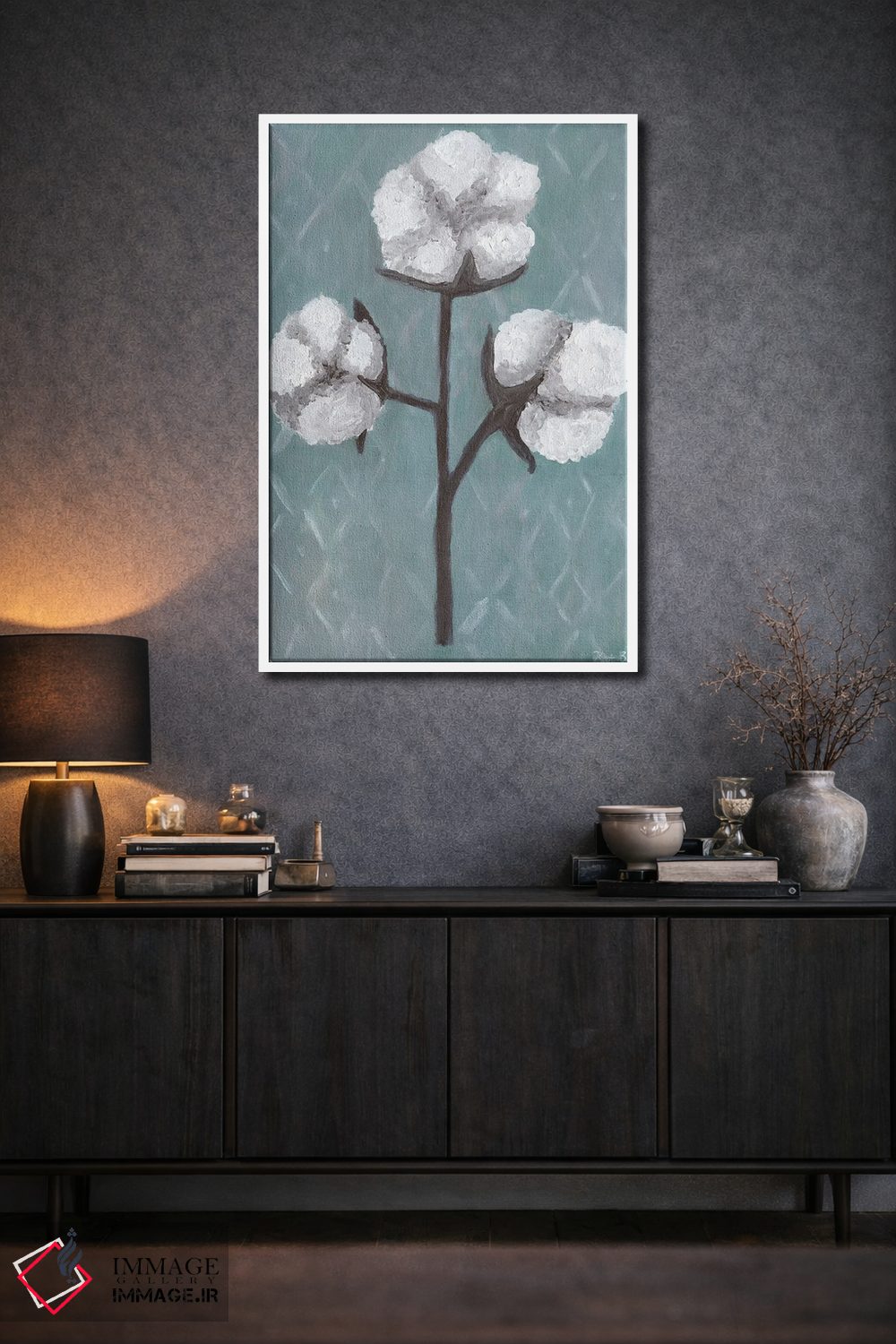 برای دیواری که میخواهید نرمتر دیده شود، «ساقههای پنبه (۲)» اثرِ «کاتلین برایان» حس طراوت را بدون شلوغی وارد اتاق میکند؛ برای فضای غذاخوری انتخابی خوشسلیقه است. حضورش آرام است، اما بیاثر نیست.