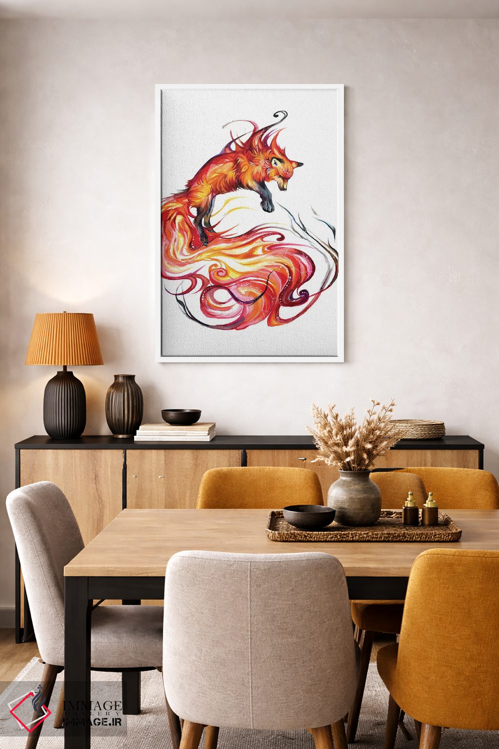 برای دکورهای صمیمی، «روباه کهکشان آتشین» اثرِ «کتی لیپسکامب» در کنار رنگهای خنثی، تضاد دلچسبی میسازد؛ برای کافههای کوچک و صمیمی انتخابی خوشسلیقه است. اگر دنبال اثر دوستداشتنیِ «بیغلو» هستید، این یکی دقیق مینشیند.