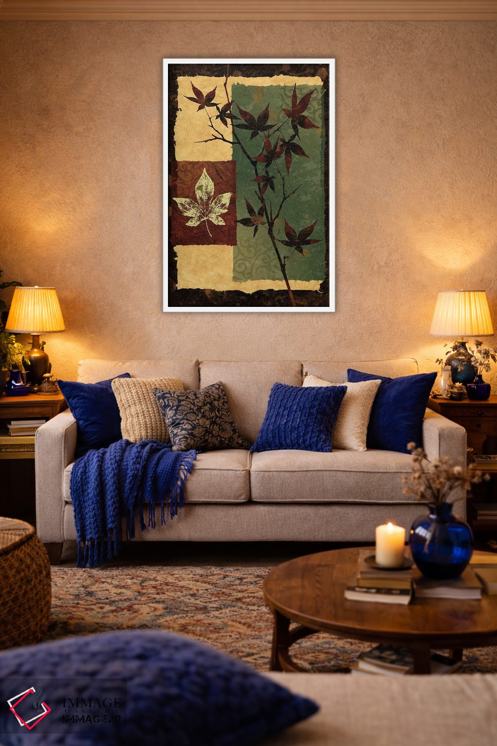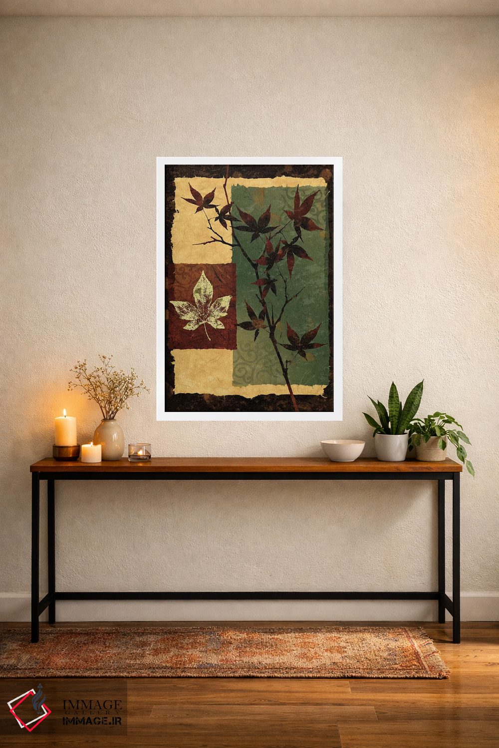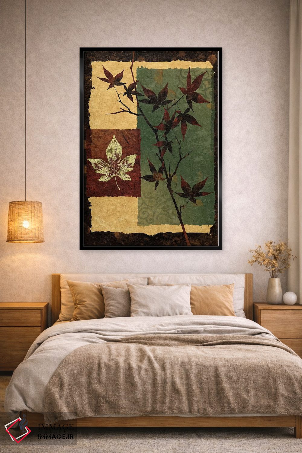 براساس پالت ترکیبی اثر، قاب تیک گرم (چوبی) پیشنهاد اول است و مشکی مات (فریم متوسط) مکمل. برای سفارشهای پروژهای با ابعاد و قابهای اختصاصی با ایماژ در تماس باشید.