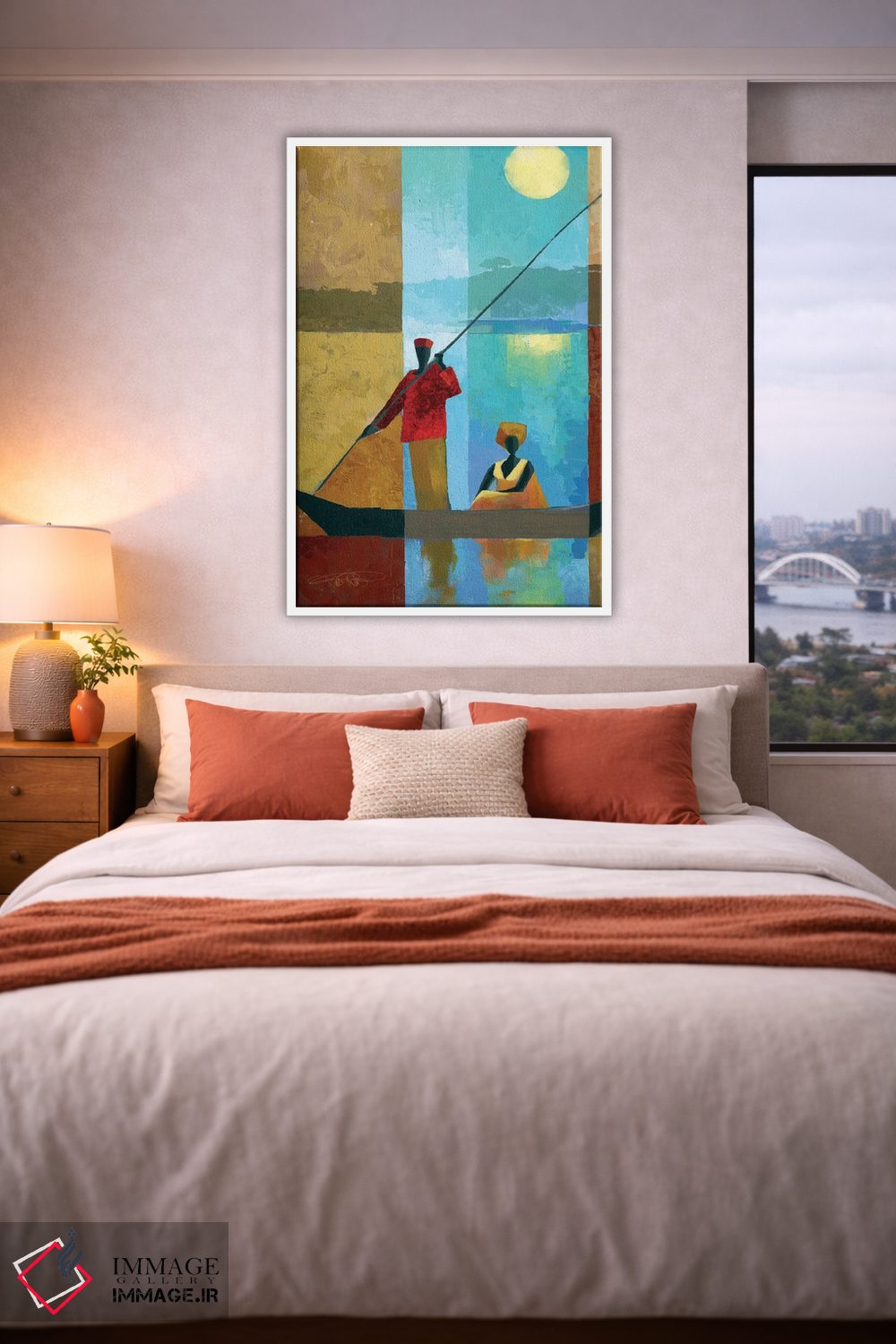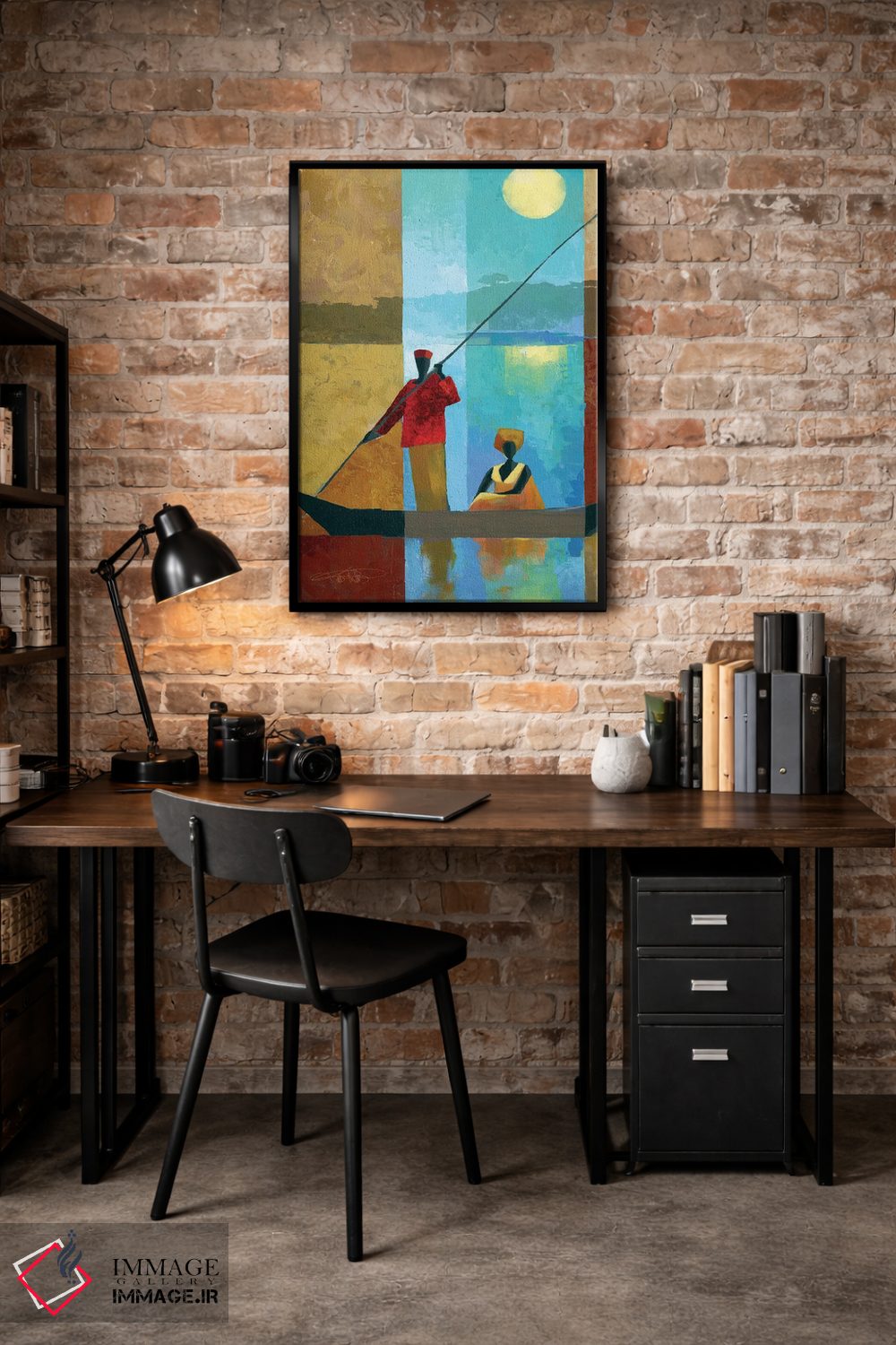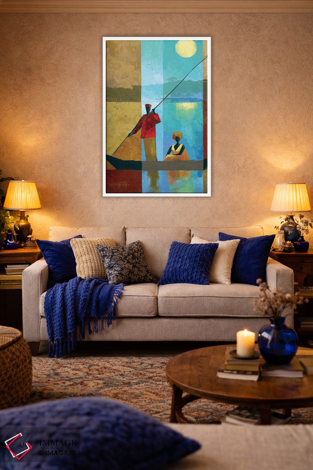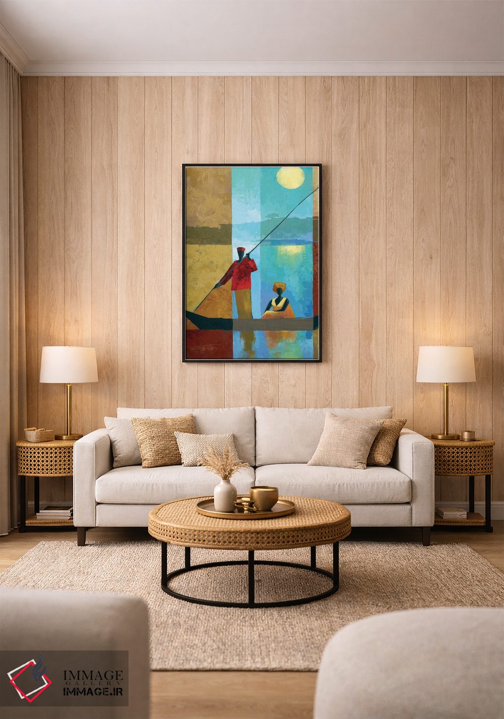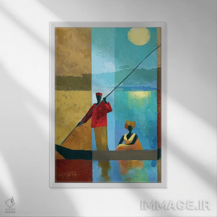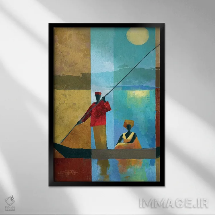 براساس پالت ترکیبی اثر، قاب تیک گرم (چوبی) پیشنهاد اول است و مشکی مات (فریم متوسط) مکمل. برای سفارشهای پروژهای با ابعاد و قابهای اختصاصی با ایماژ در تماس باشید.