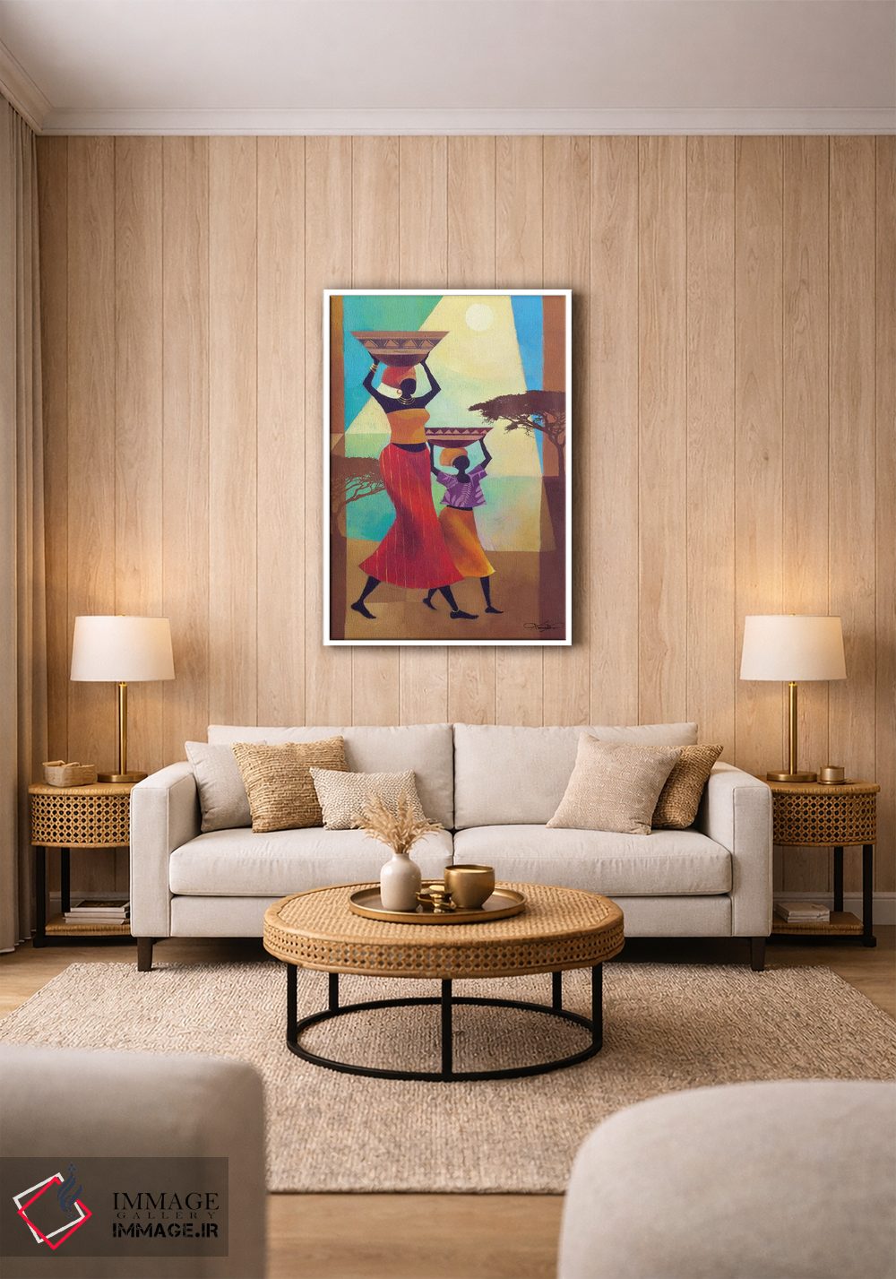 براساس پالت ترکیبی اثر، قاب تیک گرم (چوبی) پیشنهاد اول است و مشکی مات (فریم متوسط) مکمل. برای سفارشهای پروژهای با ابعاد و قابهای اختصاصی با ایماژ در تماس باشید.
