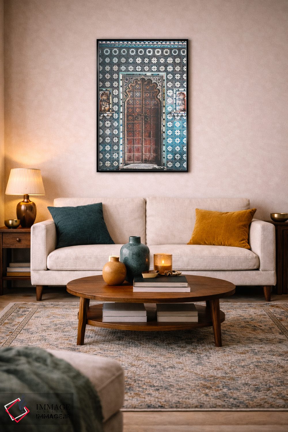 براساس پالت ترکیبی اثر، قاب تیک گرم (چوبی) پیشنهاد اول است و مشکی مات (فریم متوسط) مکمل. برای سفارشهای پروژهای با ابعاد و قابهای اختصاصی با ایماژ در تماس باشید.