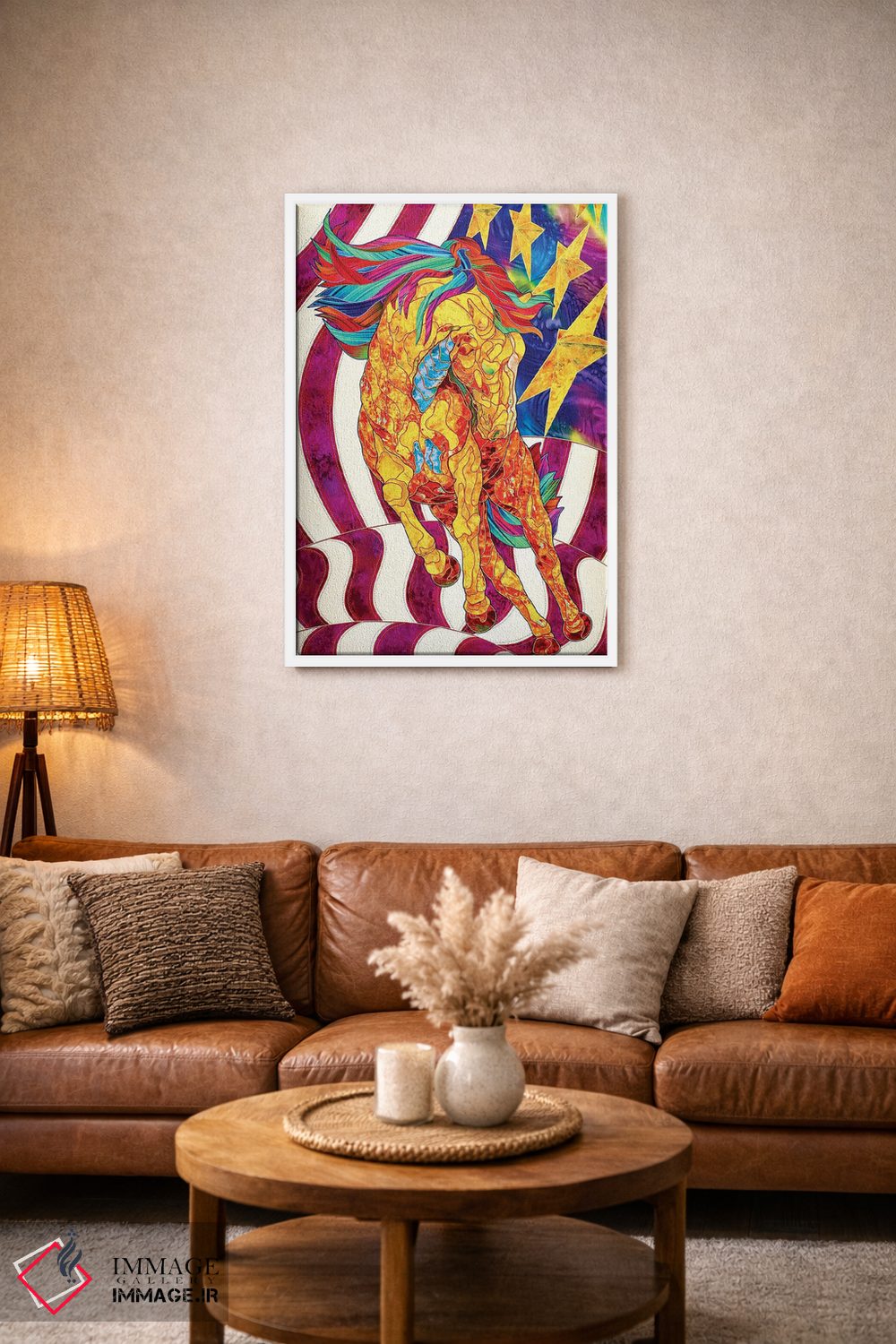 براساس پالت ترکیبی اثر، قاب تیک گرم (چوبی) پیشنهاد اول است و مشکی مات (فریم متوسط) مکمل. برای سفارشهای پروژهای با ابعاد و قابهای اختصاصی با ایماژ در تماس باشید.