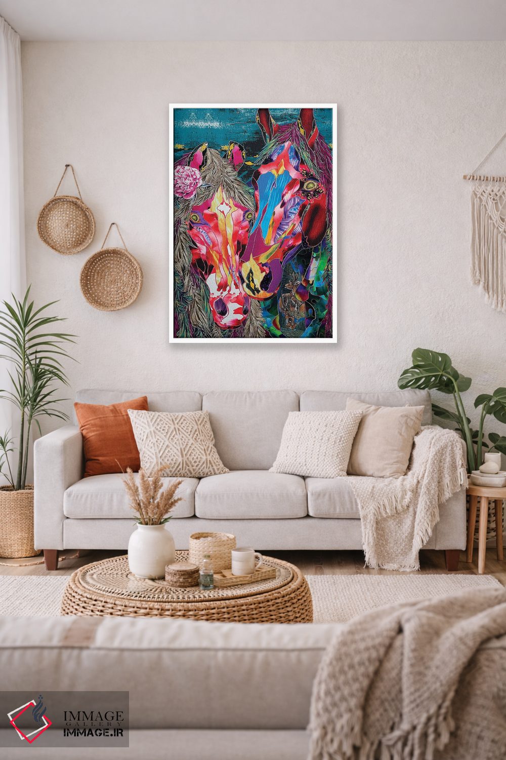 براساس پالت ترکیبی اثر، قاب تیک گرم (چوبی) پیشنهاد اول است و مشکی مات (فریم متوسط) مکمل. برای سفارشهای پروژهای با ابعاد و قابهای اختصاصی با ایماژ در تماس باشید.
