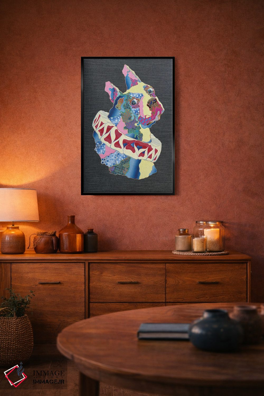 براساس پالت ترکیبی اثر، قاب تیک گرم (چوبی) پیشنهاد اول است و مشکی مات (فریم متوسط) مکمل. برای سفارشهای پروژهای با ابعاد و قابهای اختصاصی با ایماژ در تماس باشید.