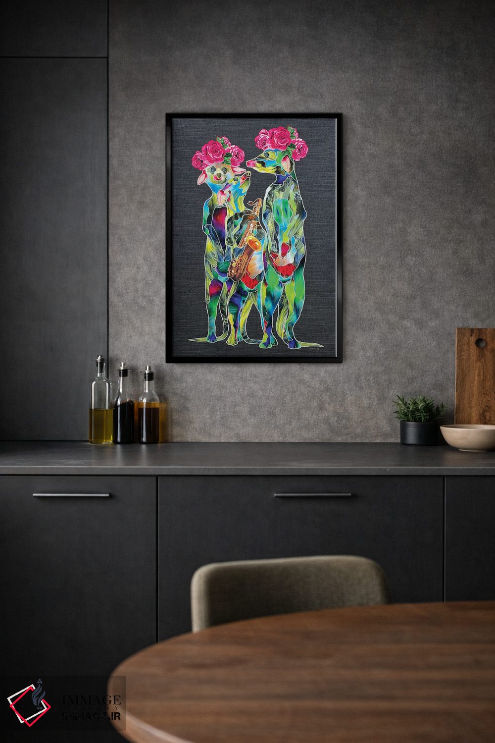 براساس پالت ترکیبی اثر، قاب تیک گرم (چوبی) پیشنهاد اول است و مشکی مات (فریم متوسط) مکمل.