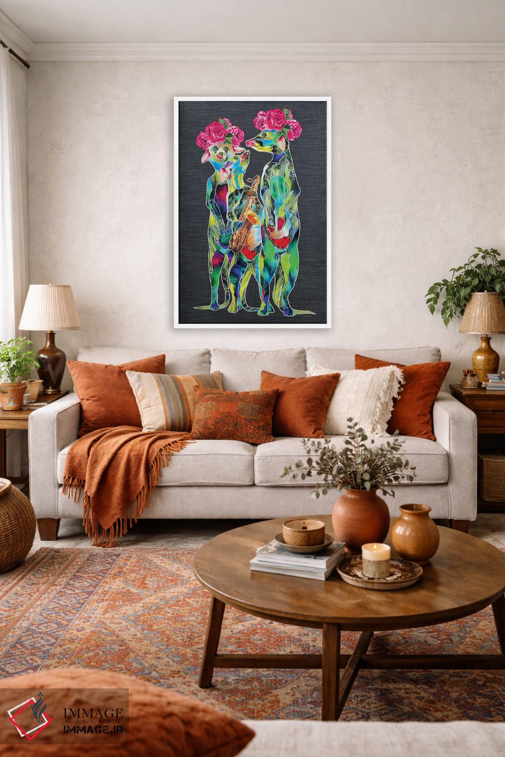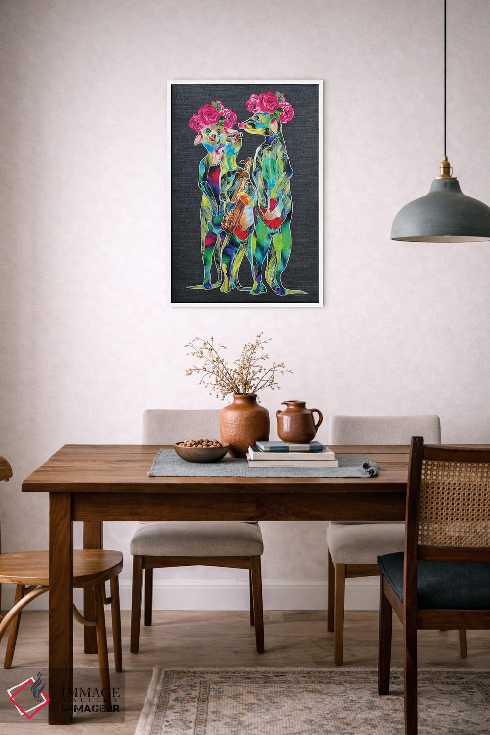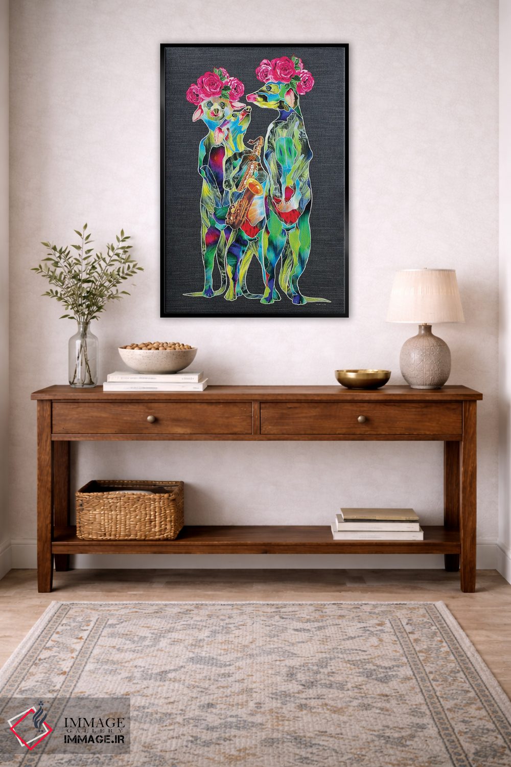 براساس پالت ترکیبی اثر، قاب تیک گرم (چوبی) پیشنهاد اول است و مشکی مات (فریم متوسط) مکمل. برای سفارشهای پروژهای با ابعاد و قابهای اختصاصی با ایماژ در تماس باشید.