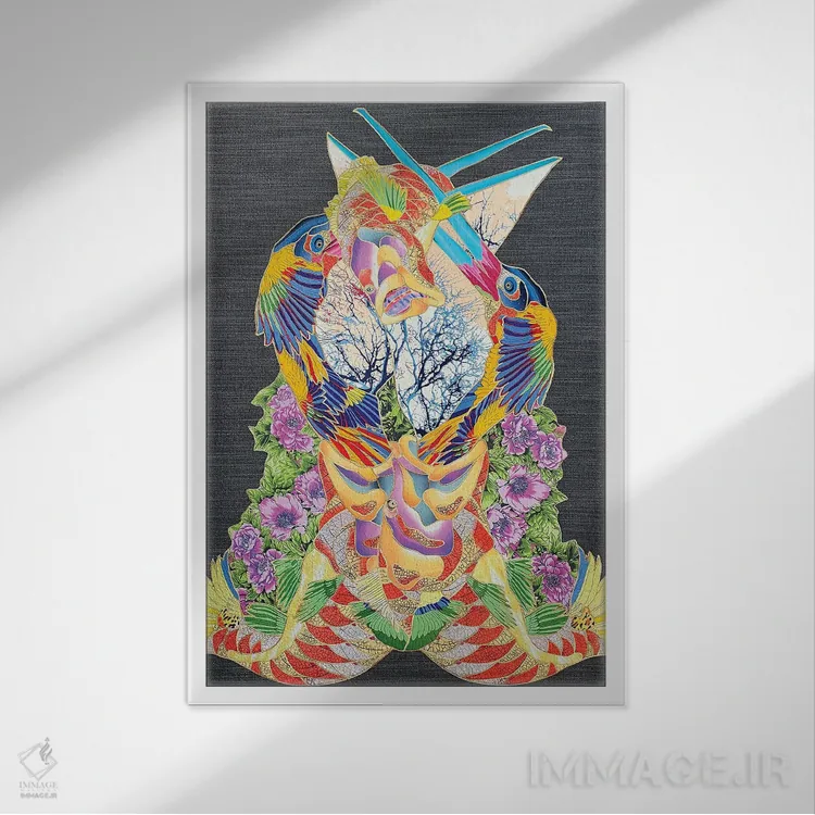 براساس پالت ترکیبی اثر، قاب تیک گرم (چوبی) پیشنهاد اول است و مشکی مات (فریم متوسط) مکمل. برای سفارشهای پروژهای با ابعاد و قابهای اختصاصی با ایماژ در تماس باشید.
