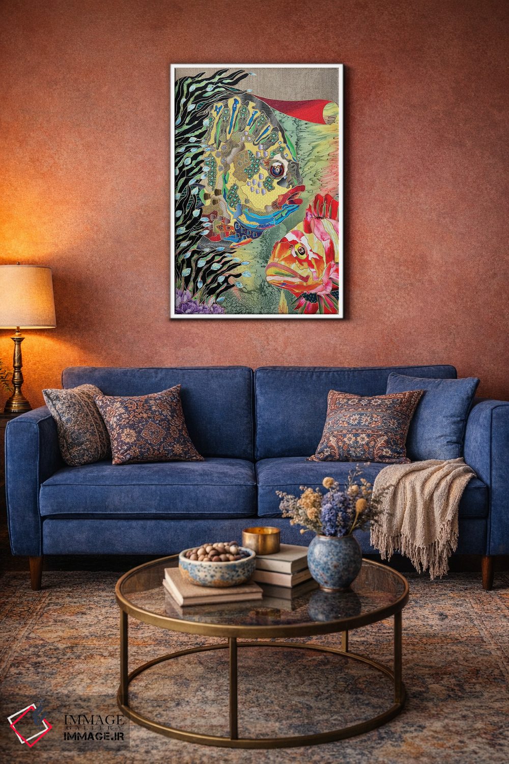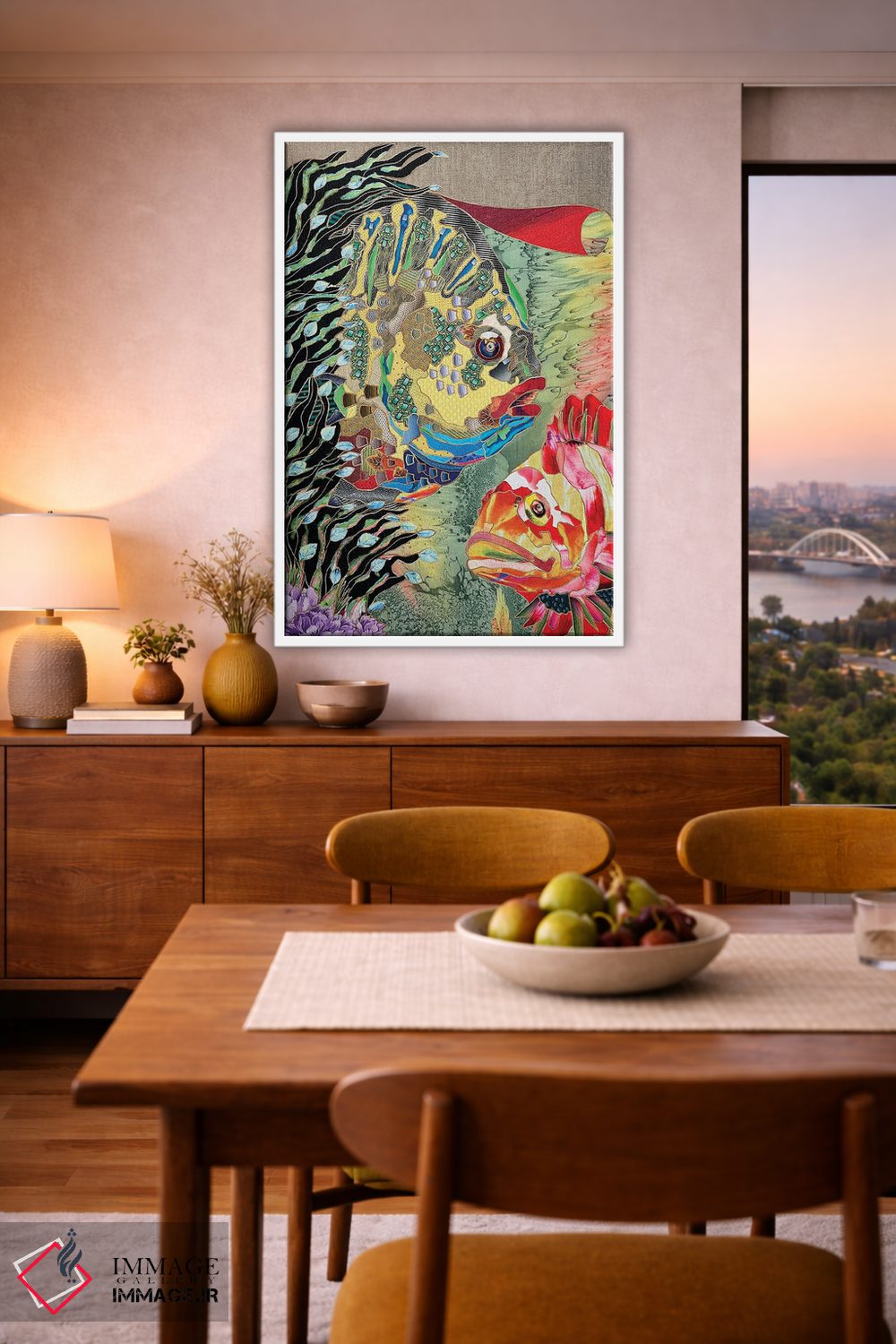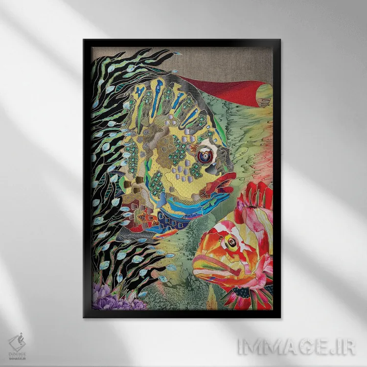 براساس پالت ترکیبی اثر، قاب تیک گرم (چوبی) پیشنهاد اول است و مشکی مات (فریم متوسط) مکمل. برای سفارشهای پروژهای با ابعاد و قابهای اختصاصی با ایماژ در تماس باشید.