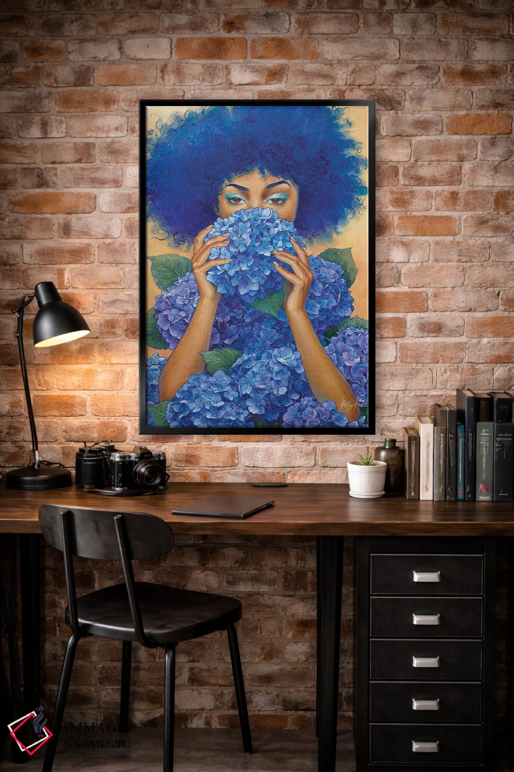 اگر به دکورهای طبیعی علاقه دارید، «هورتانسیا (نام گل)» اثرِ «کلسی مرکِل» تعادل رنگیِ لطیفی به چیدمان میدهد، برای فضاهای بوهمی گزینهٔ مناسبیست. با قاب روشن یا چوبی، حس طبیعیتری پیدا میکند.
