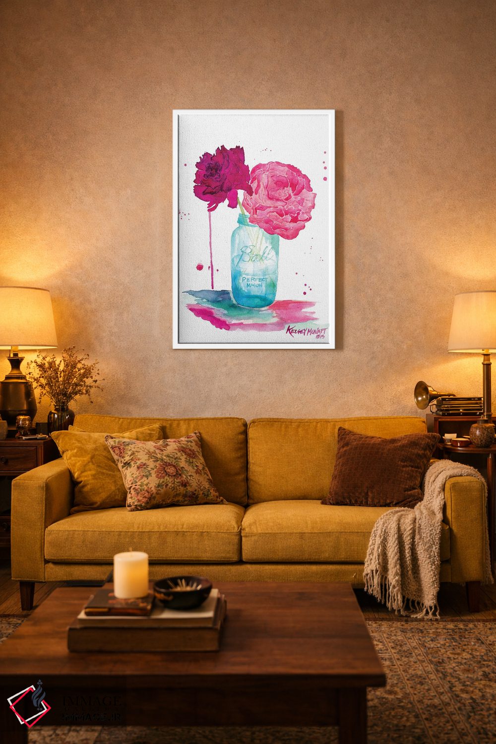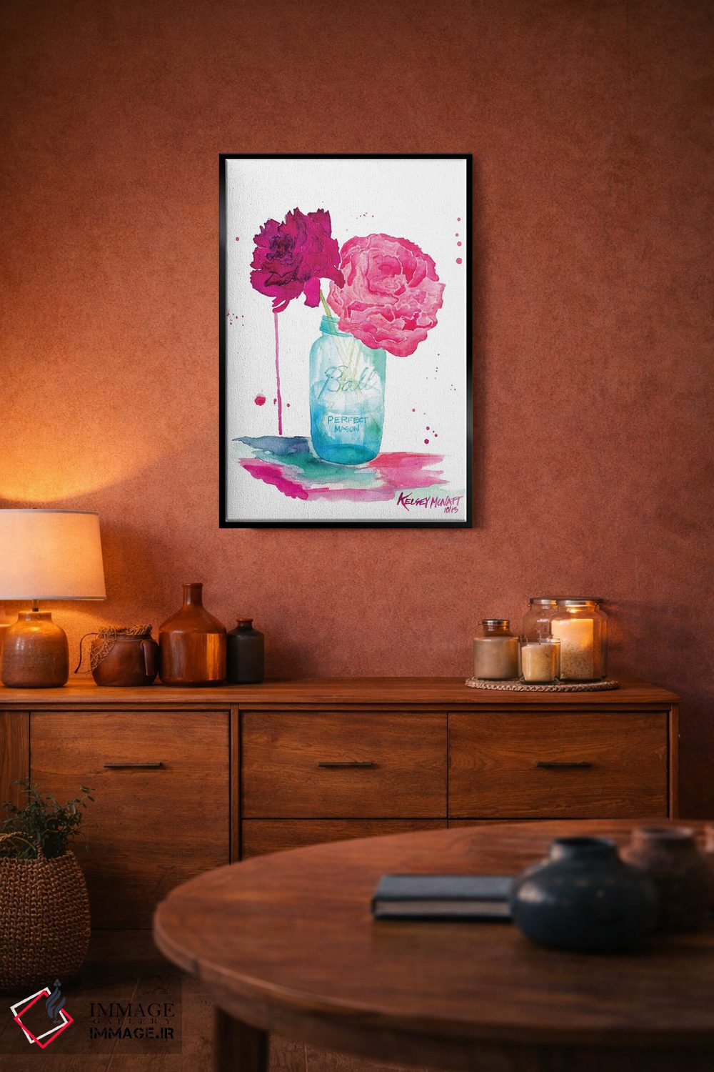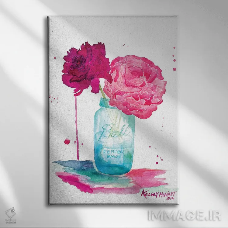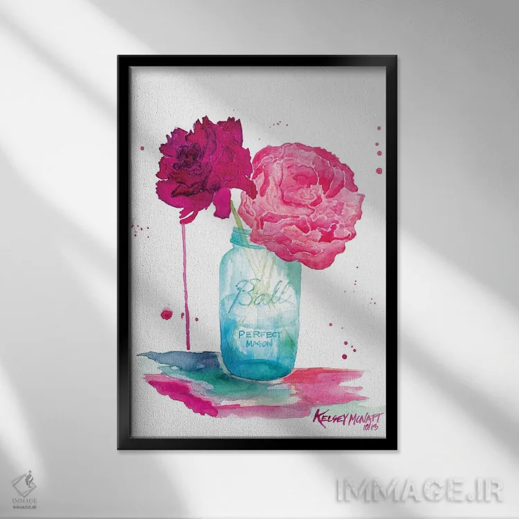 تابلو دکوراتیوِ «گلهای صدتومانی و شیشه ماسون» با موضوعِ این اثر؛ مناسب برای نشیمن، اتاق خواب یا دیوار کنار میز ناهارخوری اثرِ «کلسی مکنت».