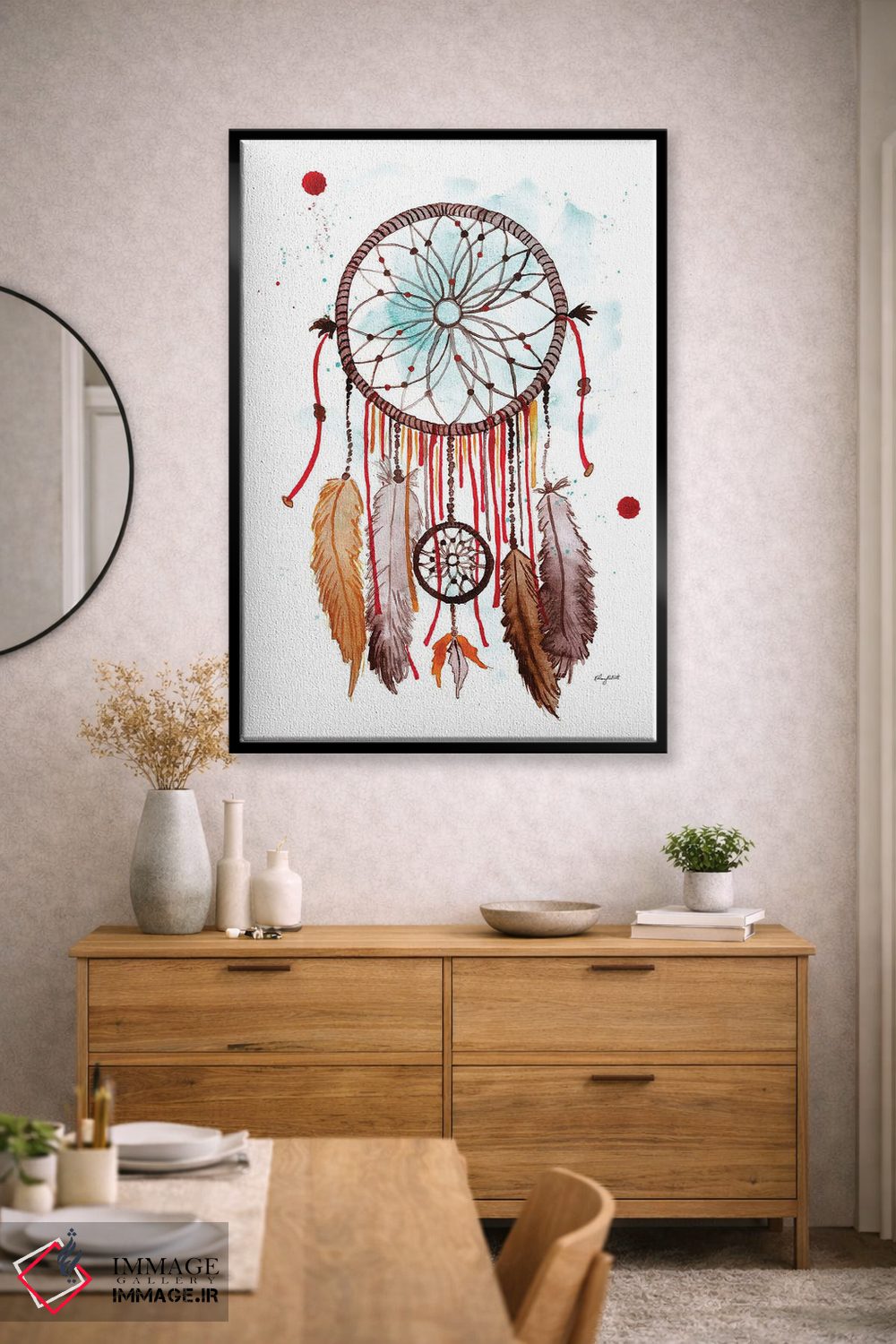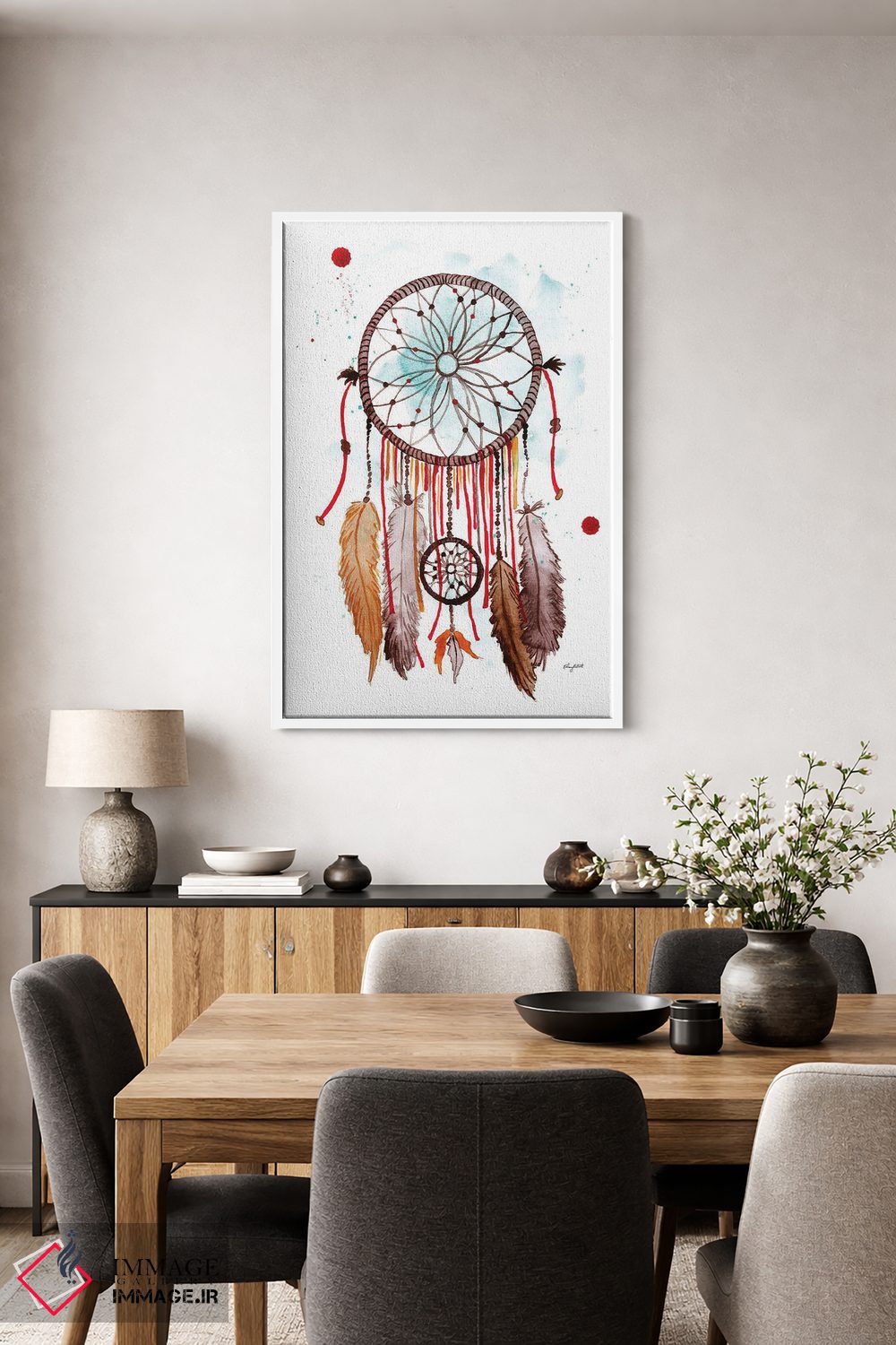 «دستساز رویاگیر II» اثرِ «کلسی مکنت» با لحن دکور بوهمی و موضوعِ این اثر، برای چیدمانهای آزاد، رنگهای گرم و بافتهای طبیعی انتخاب خوبی است.