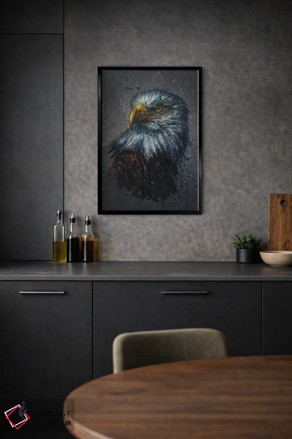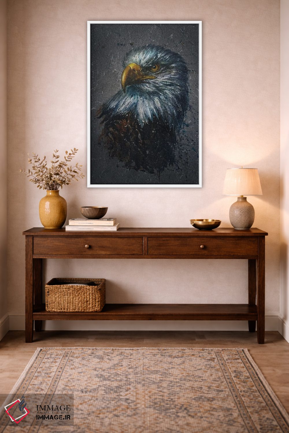 «عقاب آمریکایی (زمینه)» اثرِ «کنستانتین کالینین» میتواند به دیوار، انرژیِ نرم و زنده بدهد؛ برای هدیهدادن به دوستداران حیوانات پیشنهاد میشود. برای دیوار گالریوار هم گزینهٔ خوبیست.