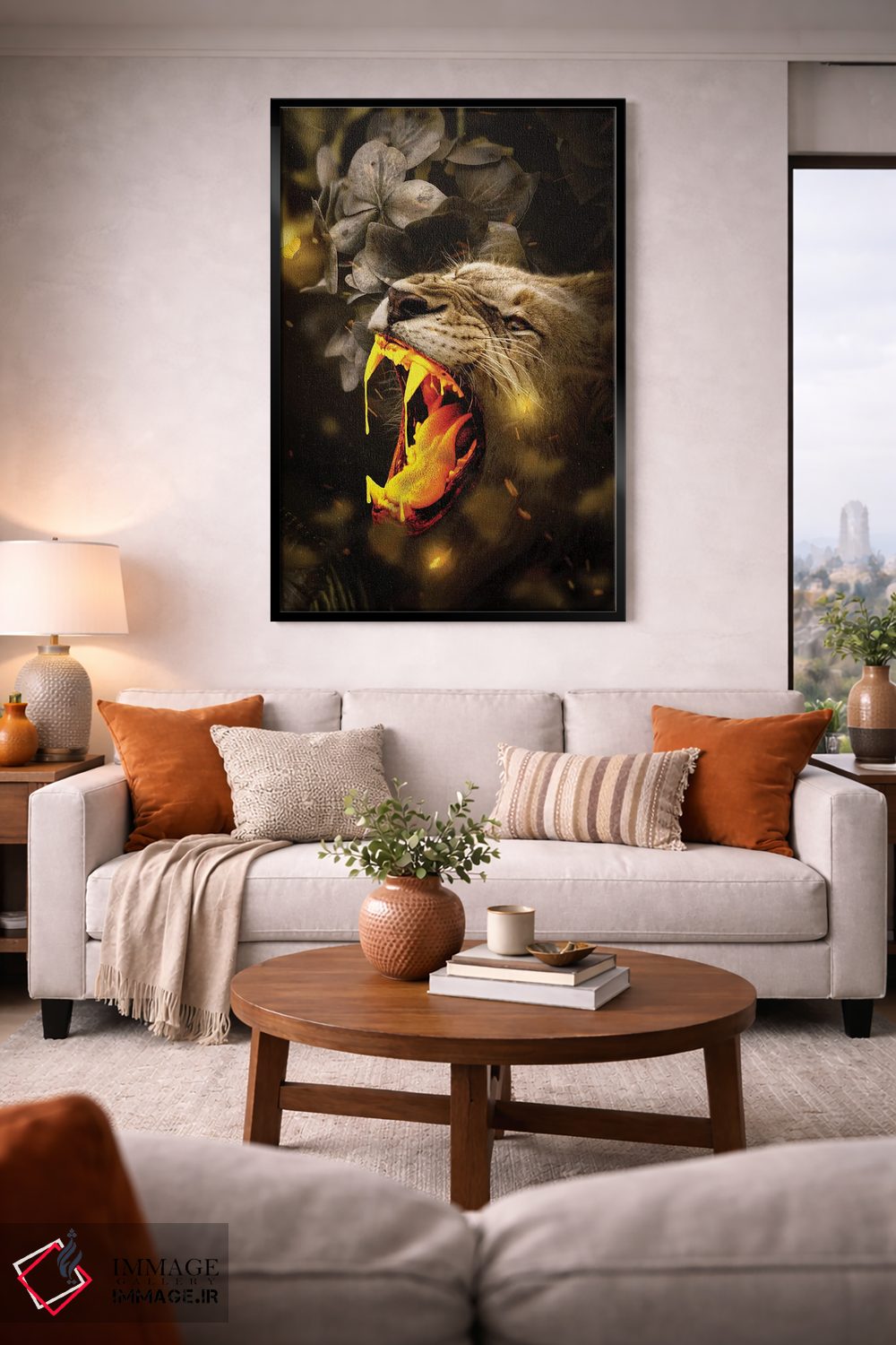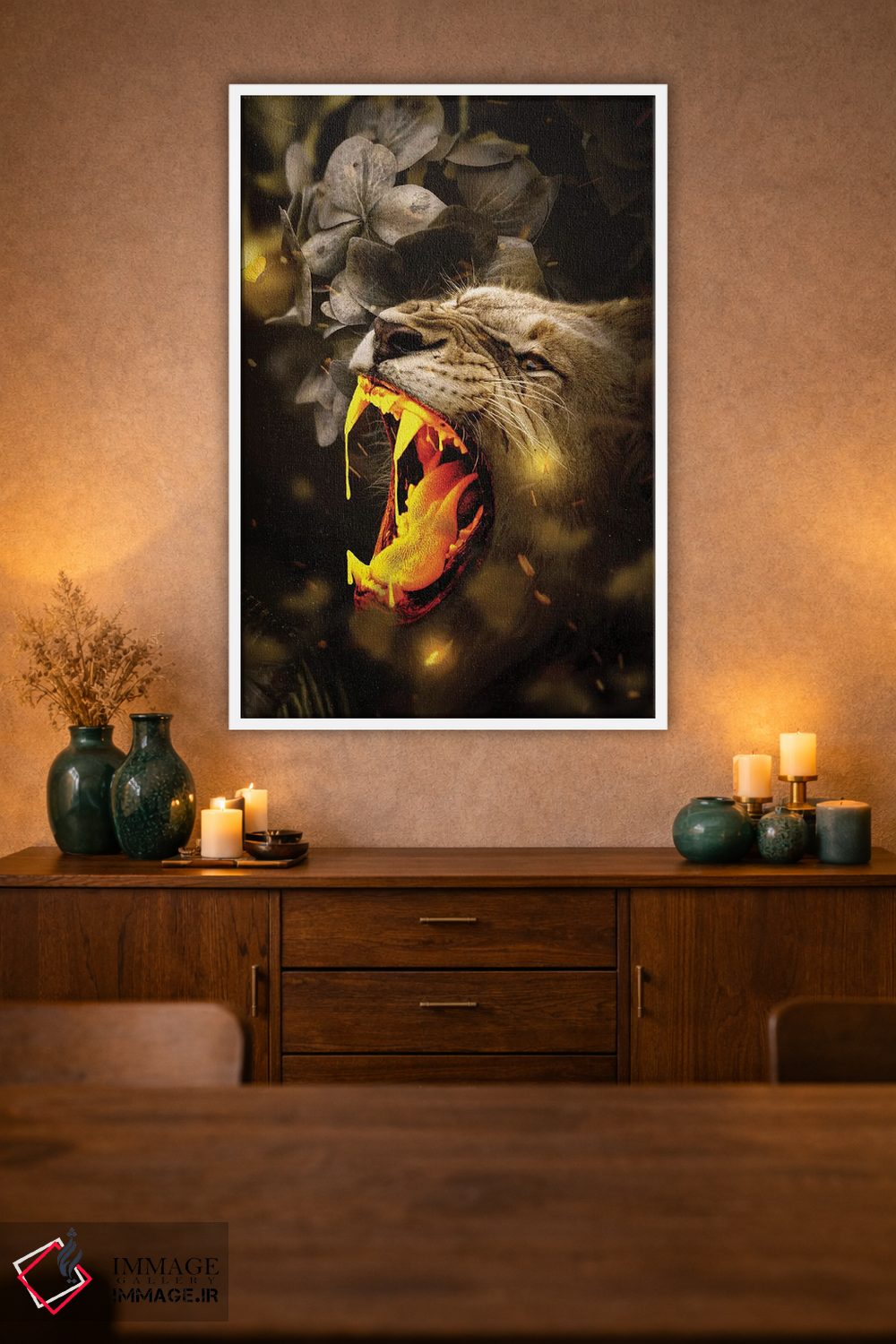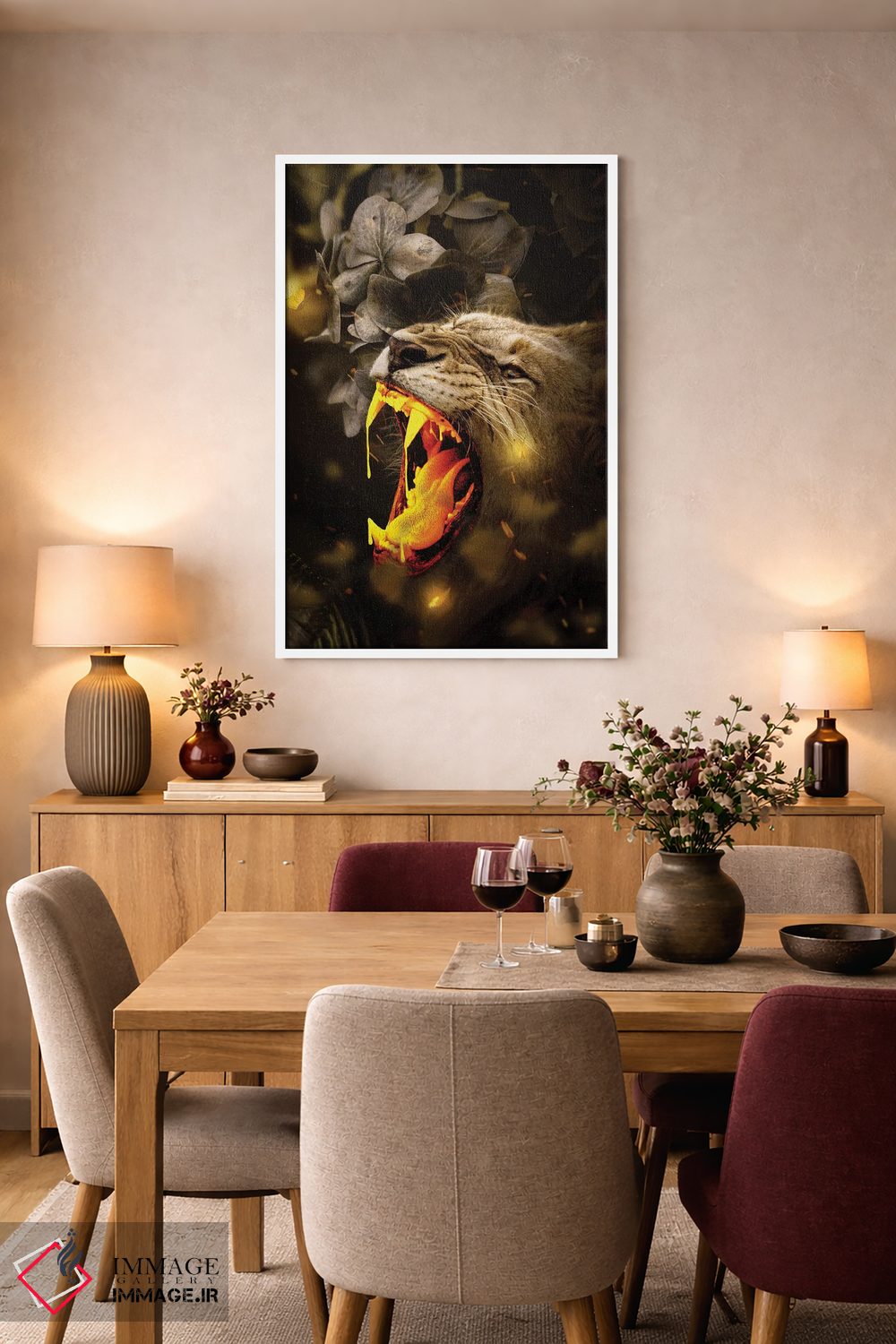 براساس پالت گرم اثر، قاب بلوط روشن (چوبی) پیشنهاد اول است و استخوانی ملایم مکمل. برای سفارشهای پروژهای با ابعاد و قابهای اختصاصی با ایماژ در تماس باشید.