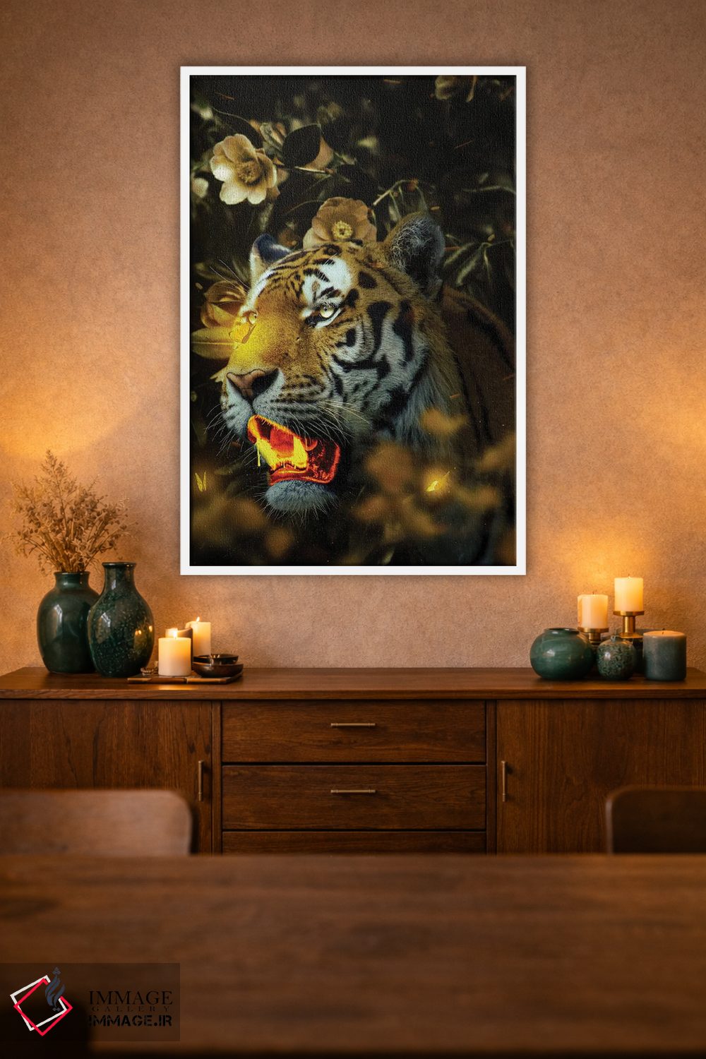 براساس پالت گرم اثر، قاب تیک گرم (چوبی) پیشنهاد اول است و مشکی مات (فریم متوسط) مکمل. برای سفارشهای پروژهای با ابعاد و قابهای اختصاصی با ایماژ در تماس باشید.