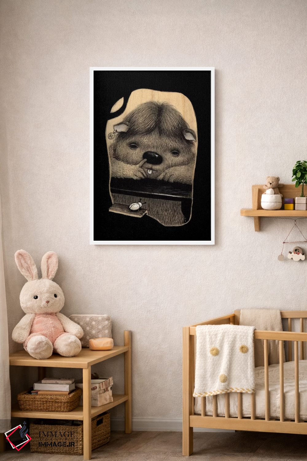 براساس پالت گرم اثر، قاب بلوط روشن (چوبی) پیشنهاد اول است و استخوانی ملایم مکمل. برای سفارشهای پروژهای با ابعاد و قابهای اختصاصی با ایماژ در تماس باشید.