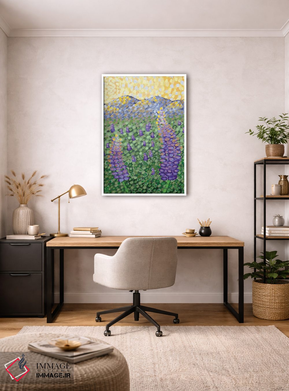 براساس پالت ترکیبی اثر، قاب تیک گرم (چوبی) پیشنهاد اول است و مشکی مات (فریم متوسط) مکمل. برای سفارشهای پروژهای با ابعاد و قابهای اختصاصی با ایماژ در تماس باشید.