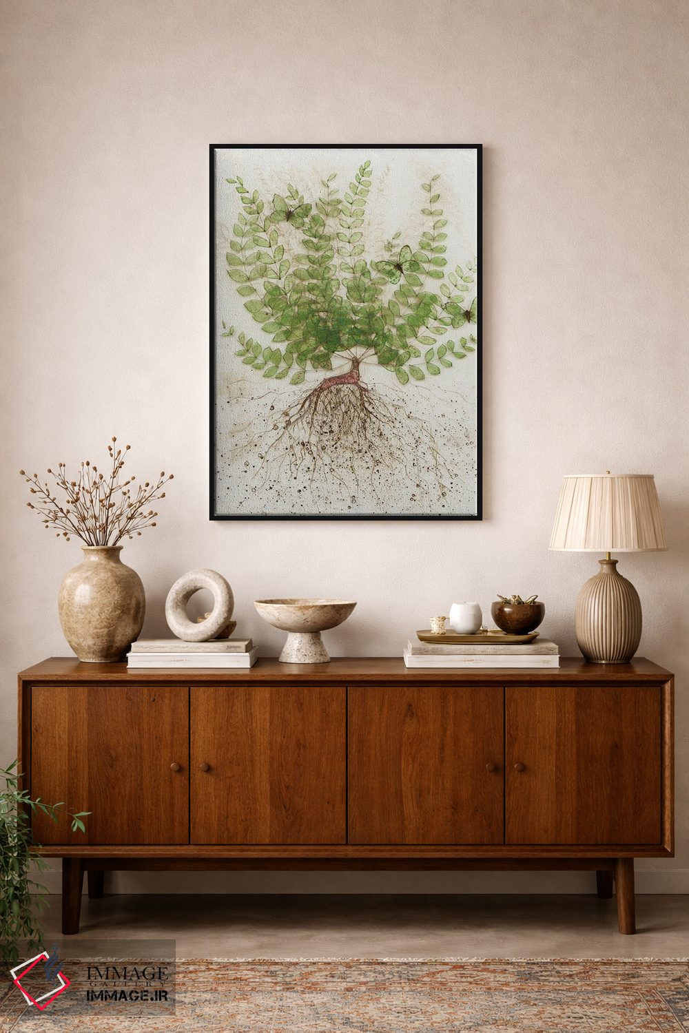 اگر میخواهید دیوار کمی سرزندگیِ محترمانه داشته باشد، «ریشهکنشده I» اثرِ «کارن سیکیه» حس طبیعت را بیدغدغه وارد خانه میکند، برای کافههای کوچک و صمیمی گزینهٔ مناسبیست. با نورپردازی نقطهای، جذابتر هم میشود.