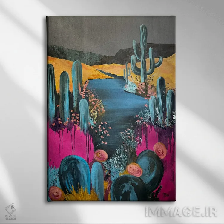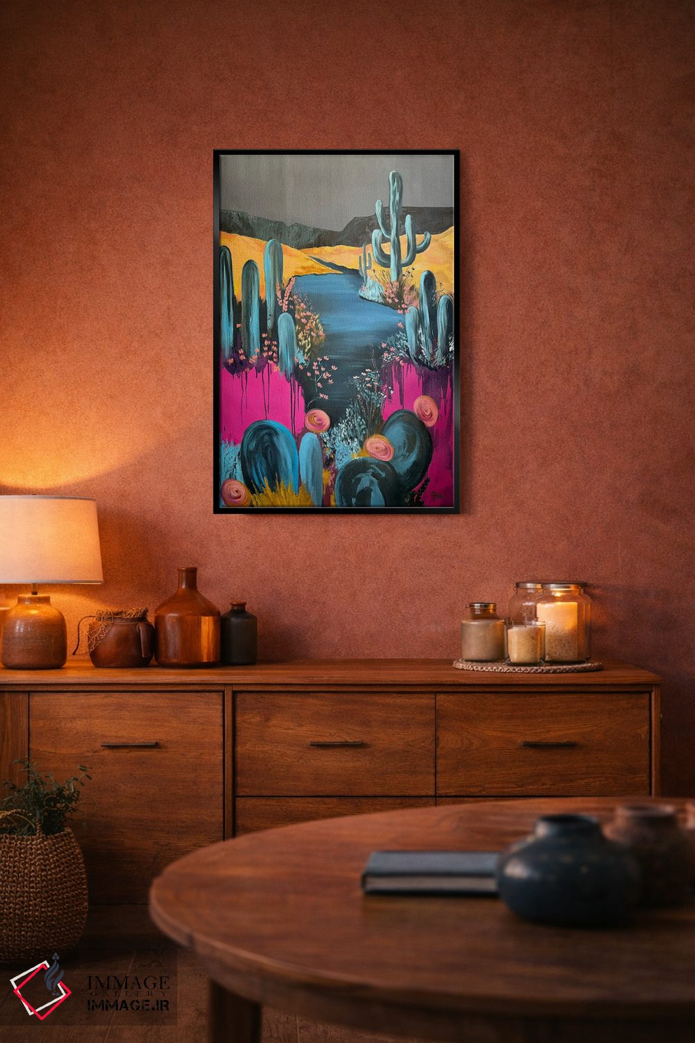براساس پالت ترکیبی اثر، قاب تیک گرم (چوبی) پیشنهاد اول است و مشکی مات (فریم متوسط) مکمل. برای سفارشهای پروژهای با ابعاد و قابهای اختصاصی با ایماژ در تماس باشید.