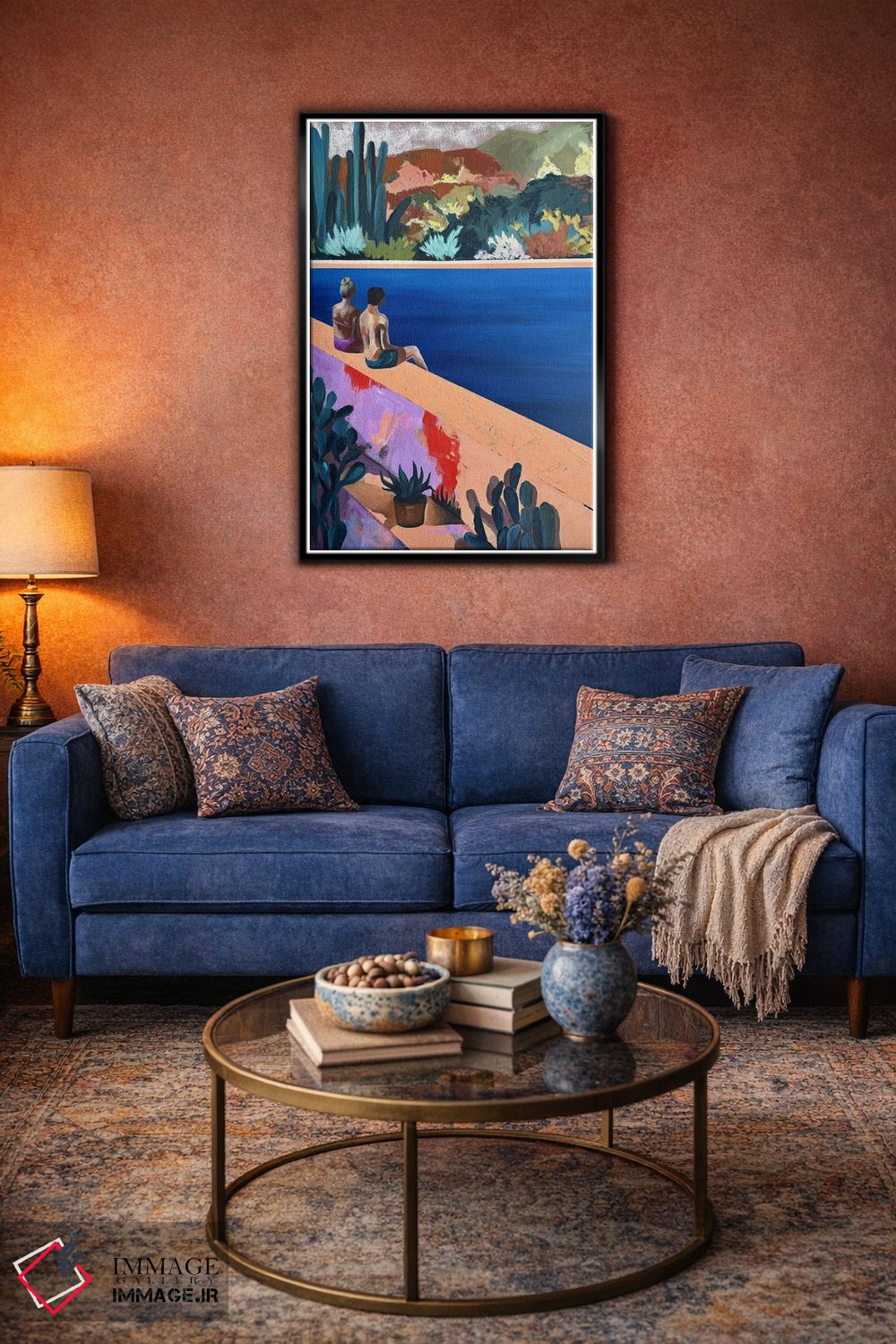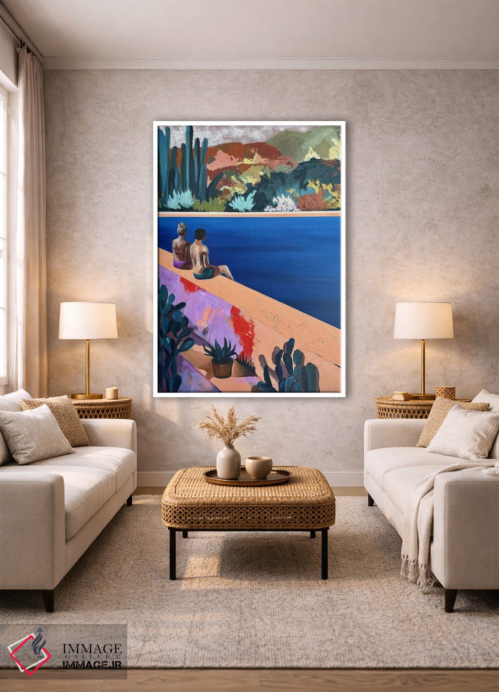 براساس پالت ترکیبی اثر، قاب تیک گرم (چوبی) پیشنهاد اول است و مشکی مات (فریم متوسط) مکمل. برای سفارشهای پروژهای با ابعاد و قابهای اختصاصی با ایماژ در تماس باشید.