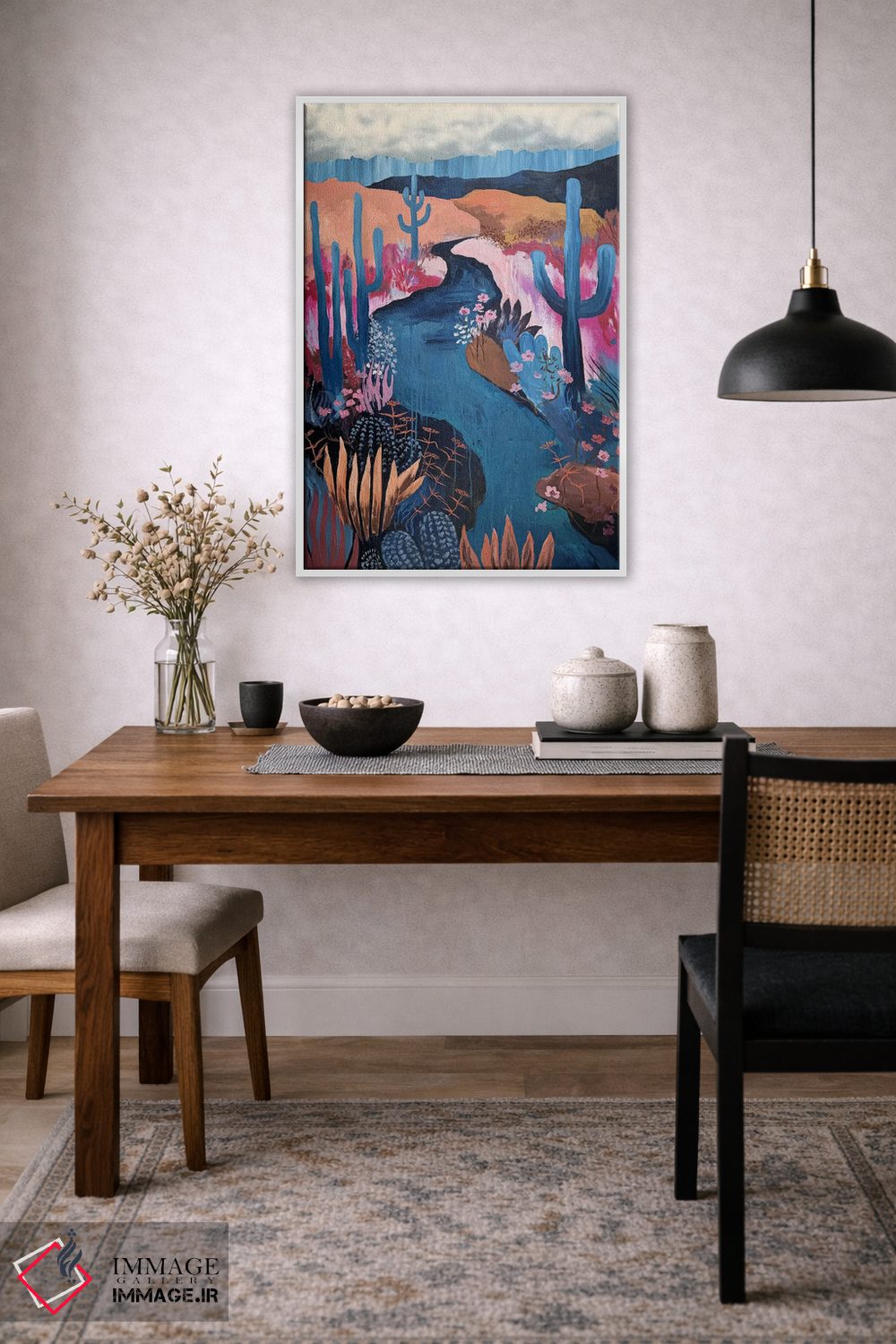 ساختار بوم گالری ایماژ طوری است که اثر روی دیوار «پرداختشده» و حرفهای دیده شود—نه پرزرقوبرقِ بیپایه؛ بلکه دقیق و خوشپرداخت. با بافت ظریف کنواس، حس اثر هنری را در نگاه نزدیک نگه میدارد و در دکورهای مدرن و کمینهگرا خیلی خوب مینشیند. در قابپذیری، هماهنگی قاب با پالت رنگ جلوه را تقویت میکند و در دکورهای مدرن و مینیمال خیلی خوب مینشیند. حاصل کار، یک تابلو خوشنشین است که هم از دور اثرگذار است و هم از نزدیک خوشخوان؛ در محیطهای کاری، این نظم بصری خیلی به چشم میآید.