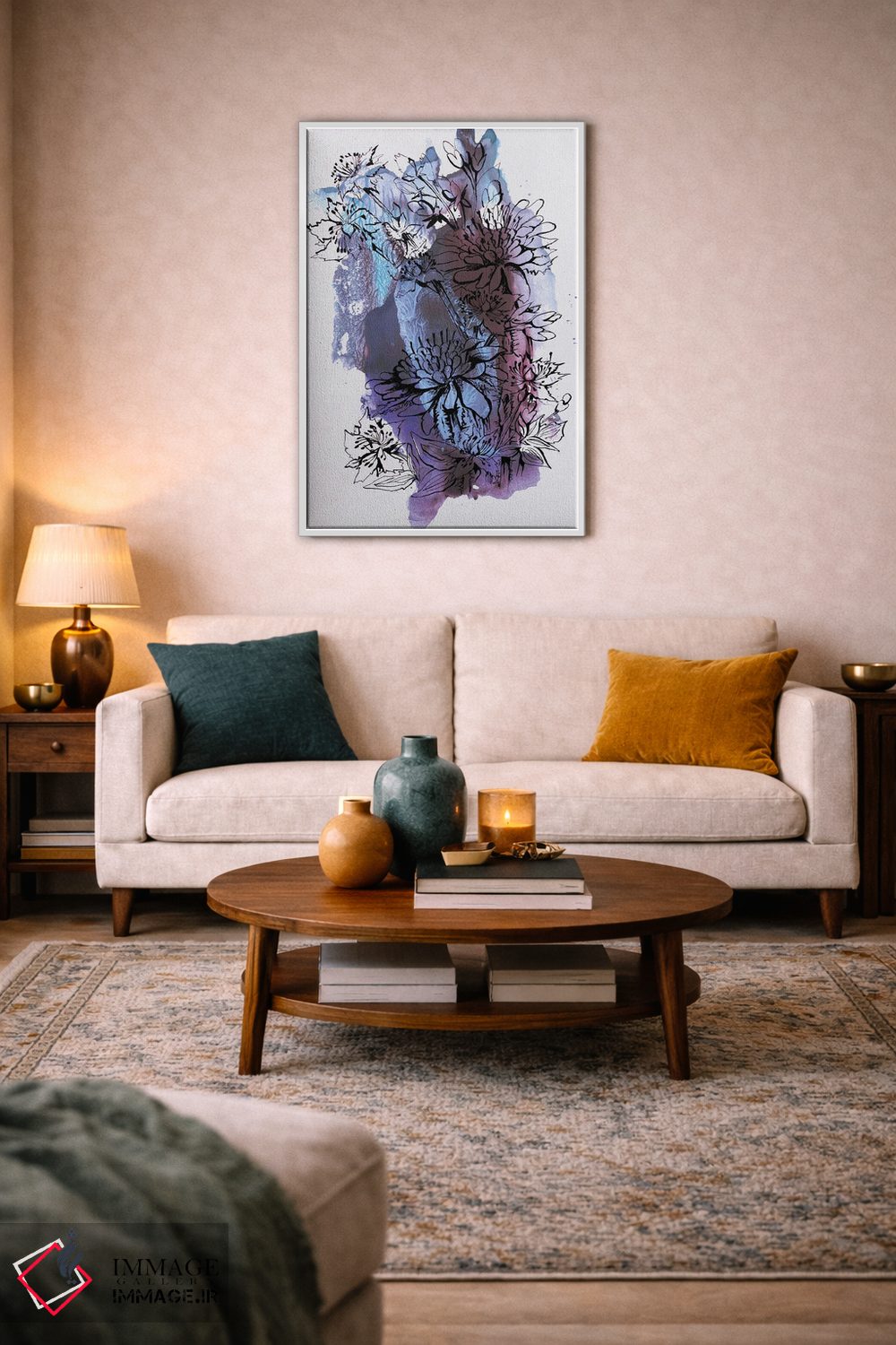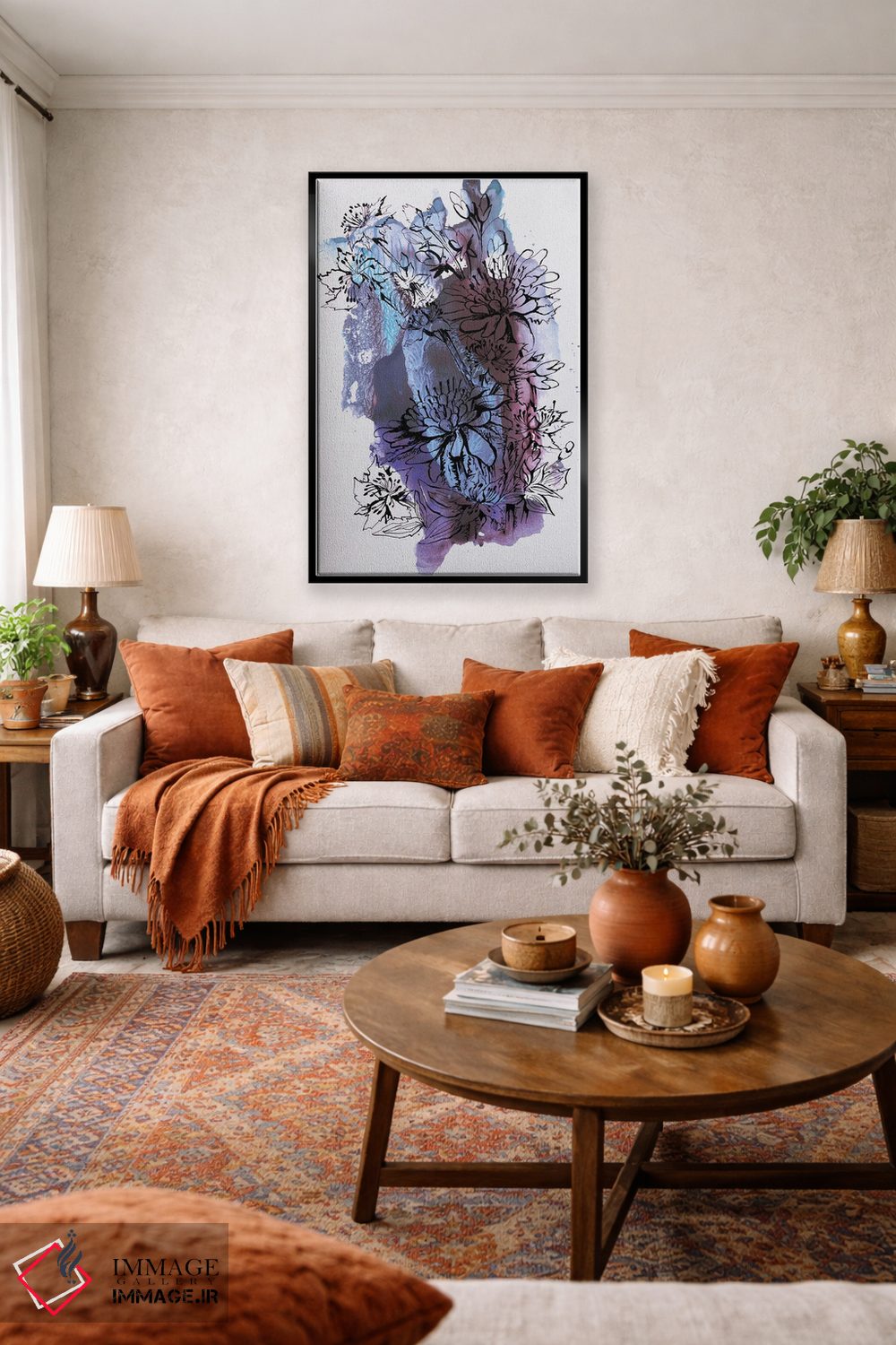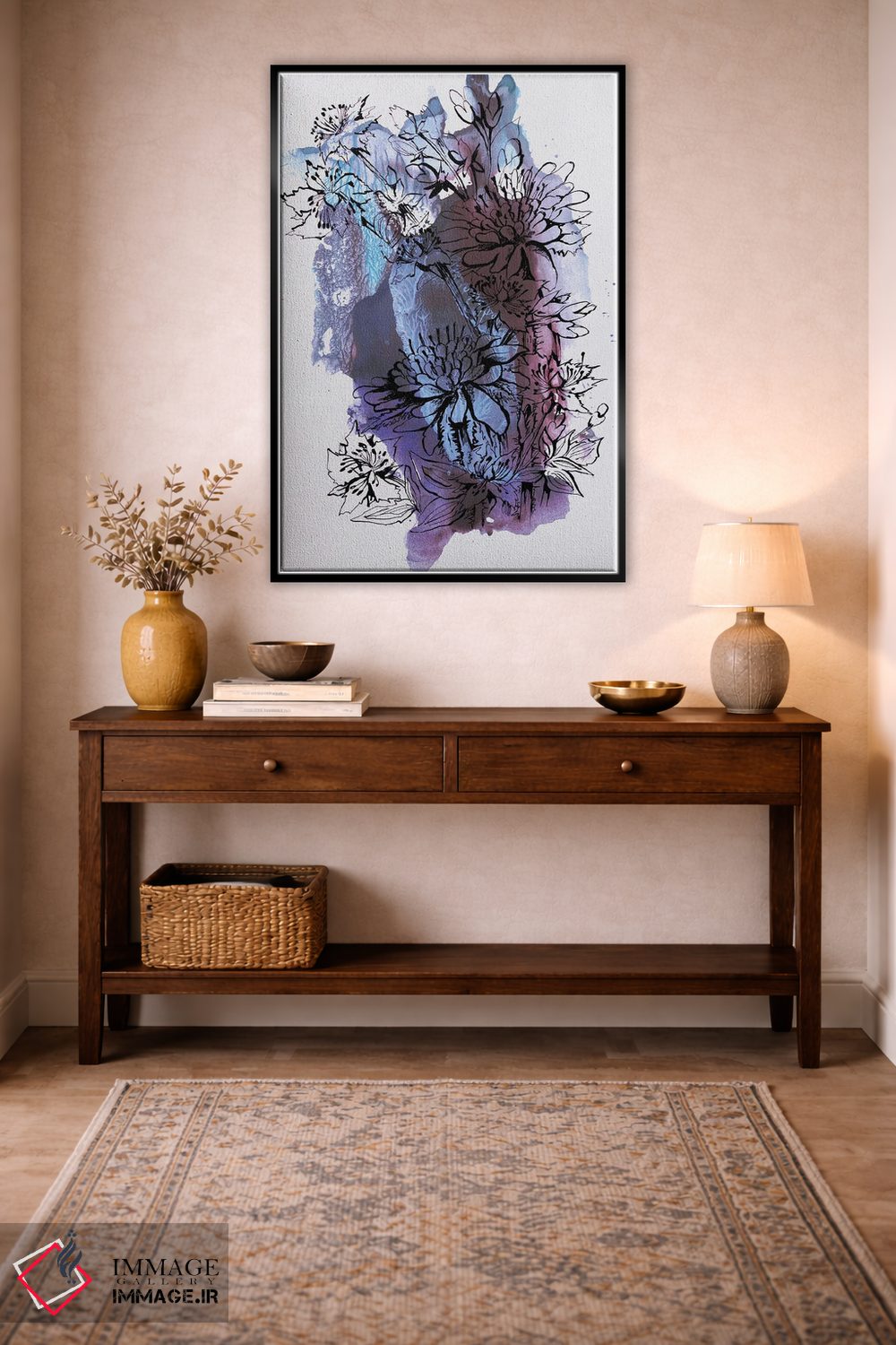تابلو انتزاعی گل ها اثر کاترینا بورتسووا - نمای روبه‌رو روی دیوار