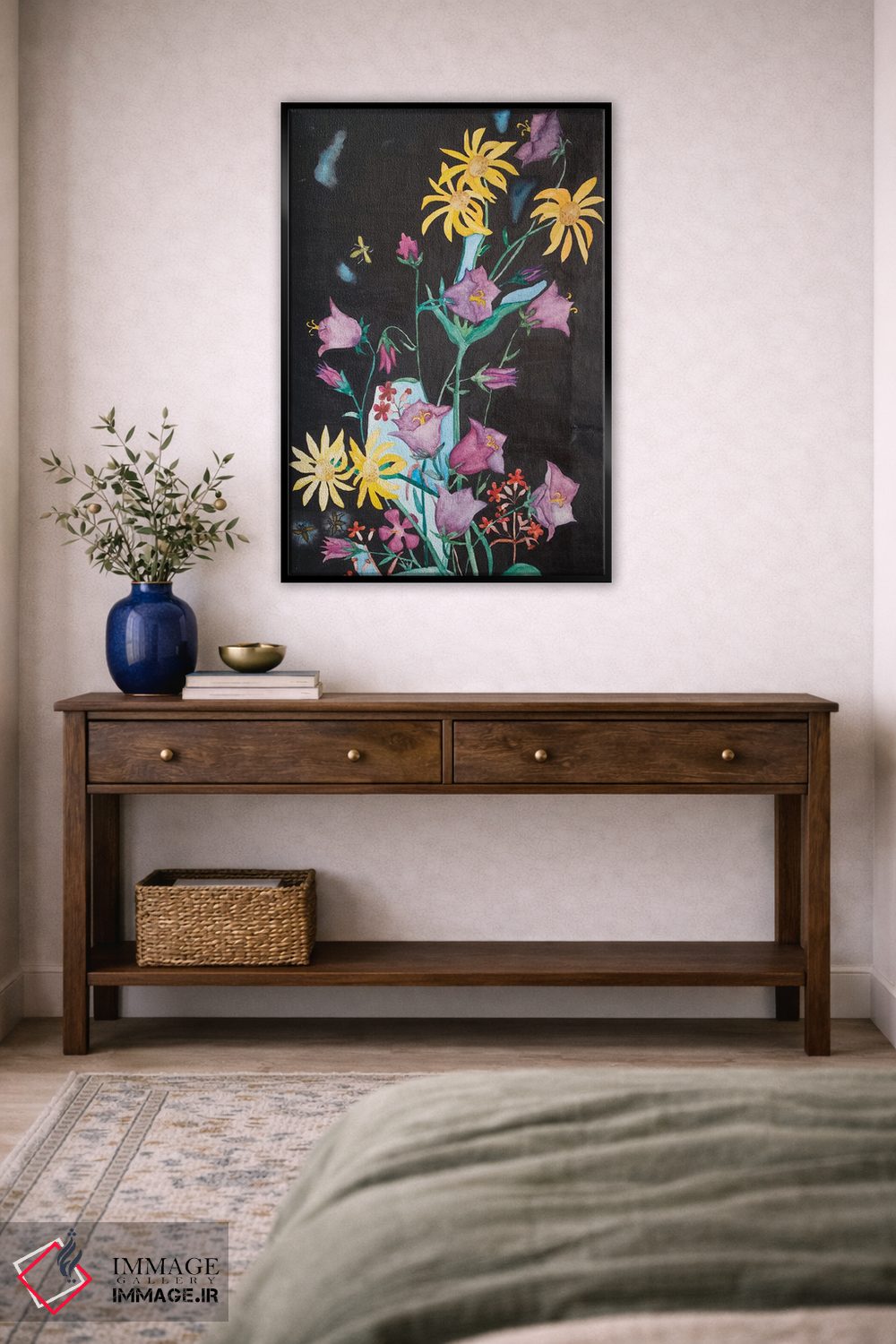 اگر به دکورهای طبیعی علاقه دارید، «گلهای زیبای باغ» اثرِ «کاترینا بورتسووا» مثل یک قطعهٔ دکورِ همیشهبهروز عمل میکند، برای کنار میز آرایش یا کنسول گزینهٔ مناسبیست. با قاب روشن یا چوبی، حس طبیعیتری پیدا میکند.