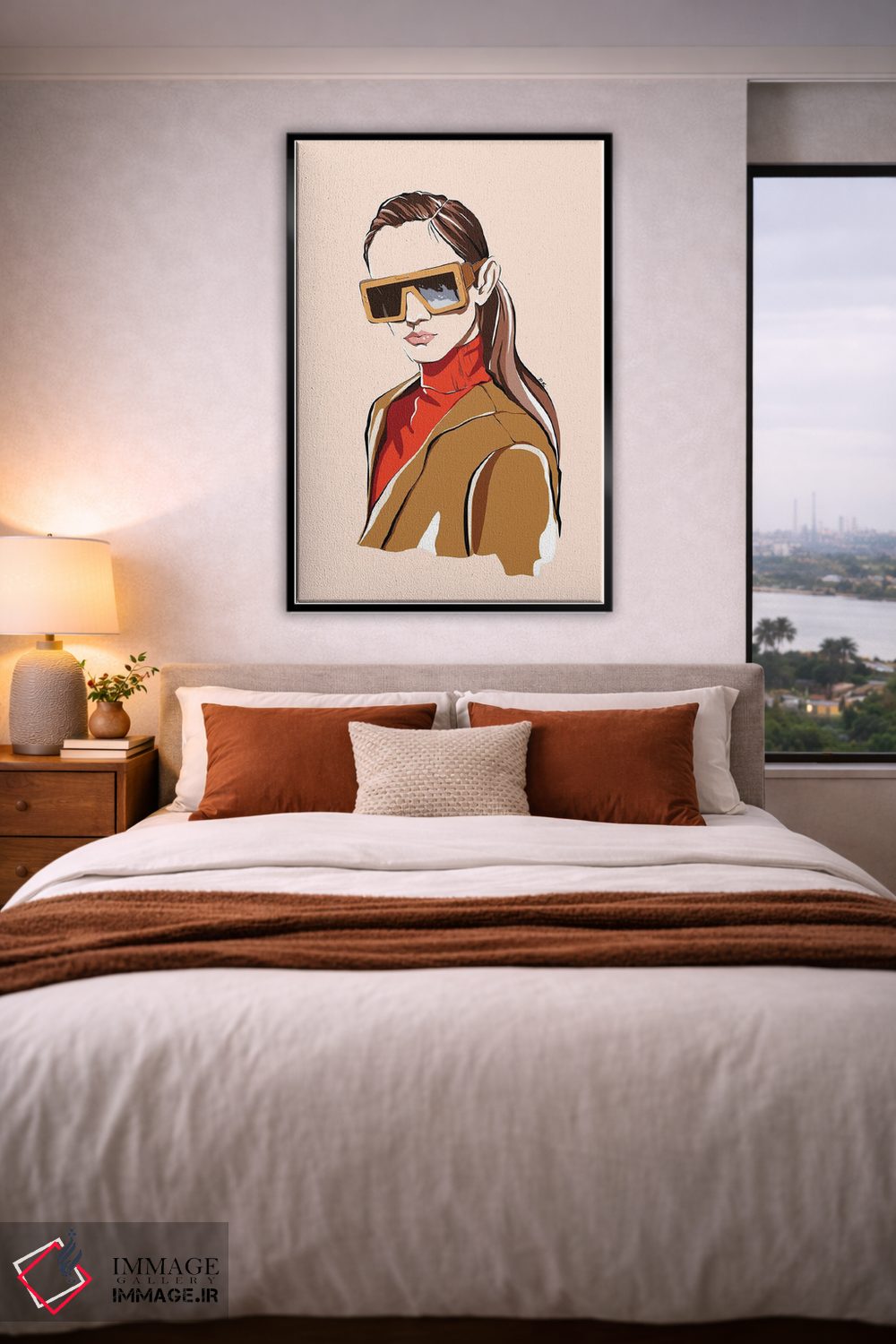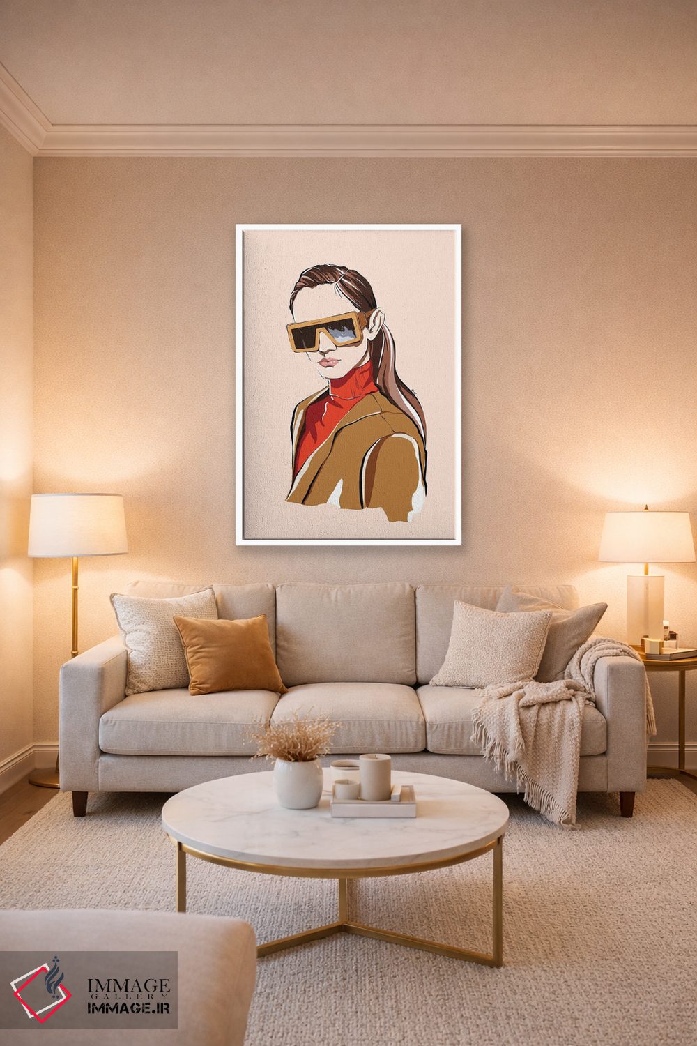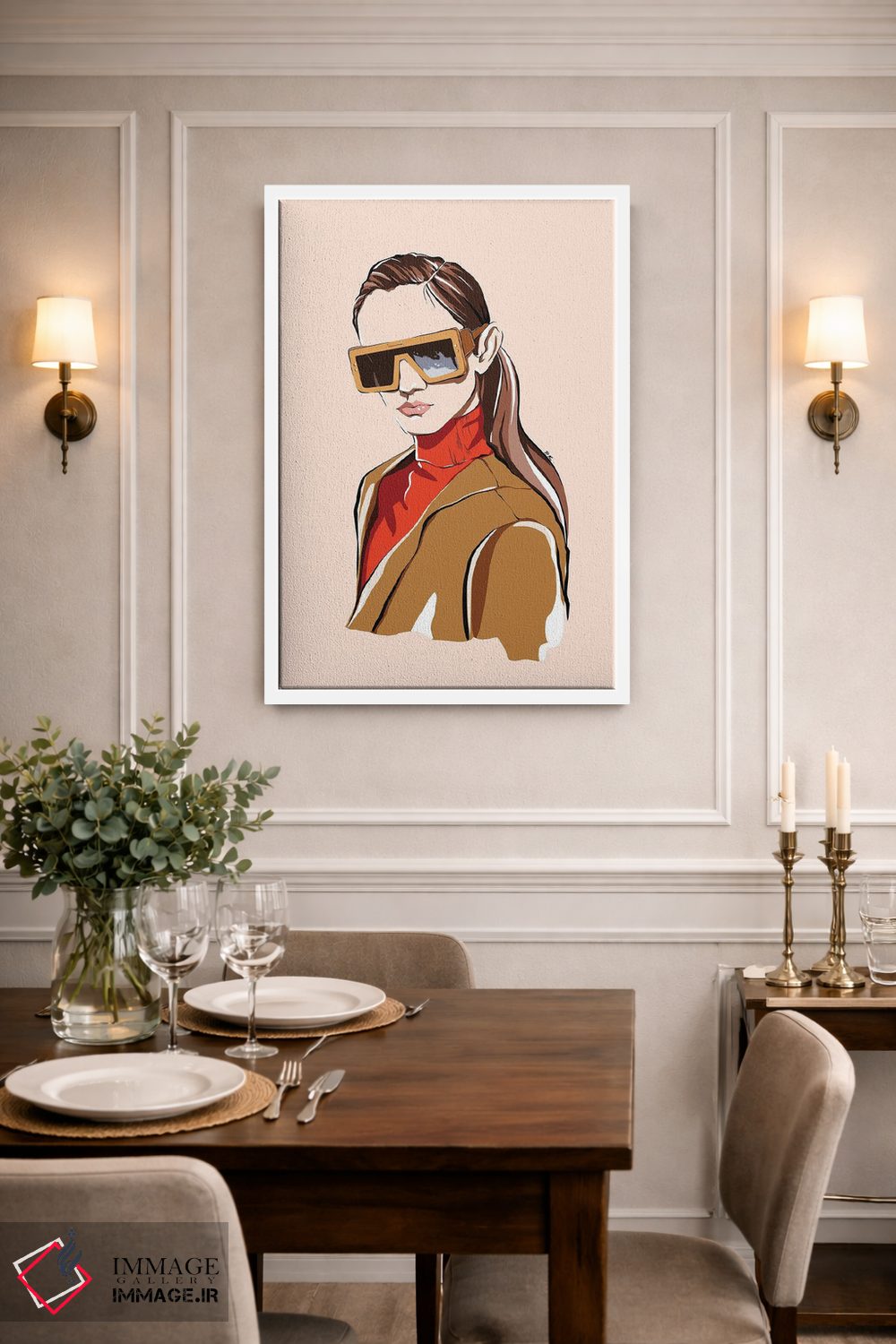 براساس پالت گرم اثر، قاب بلوط روشن (چوبی) پیشنهاد اول است و استخوانی ملایم مکمل. برای سفارشهای پروژهای با ابعاد و قابهای اختصاصی با ایماژ در تماس باشید.
