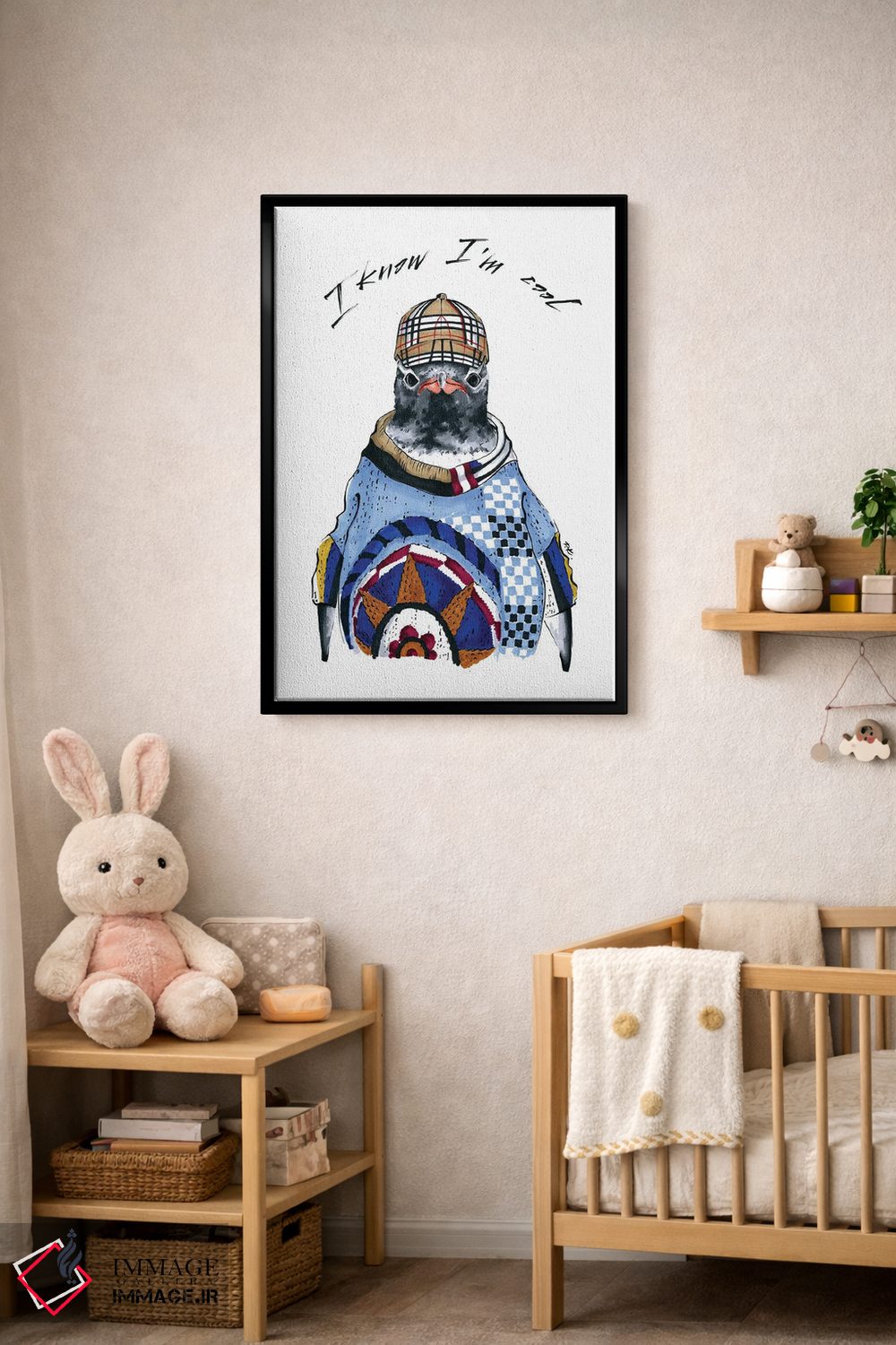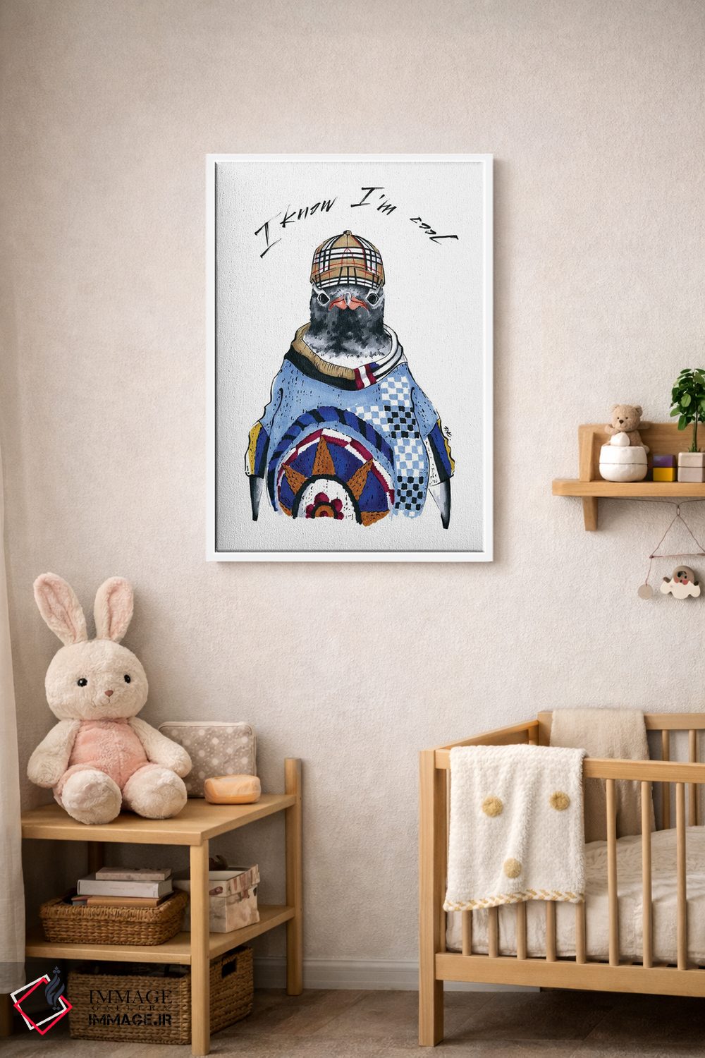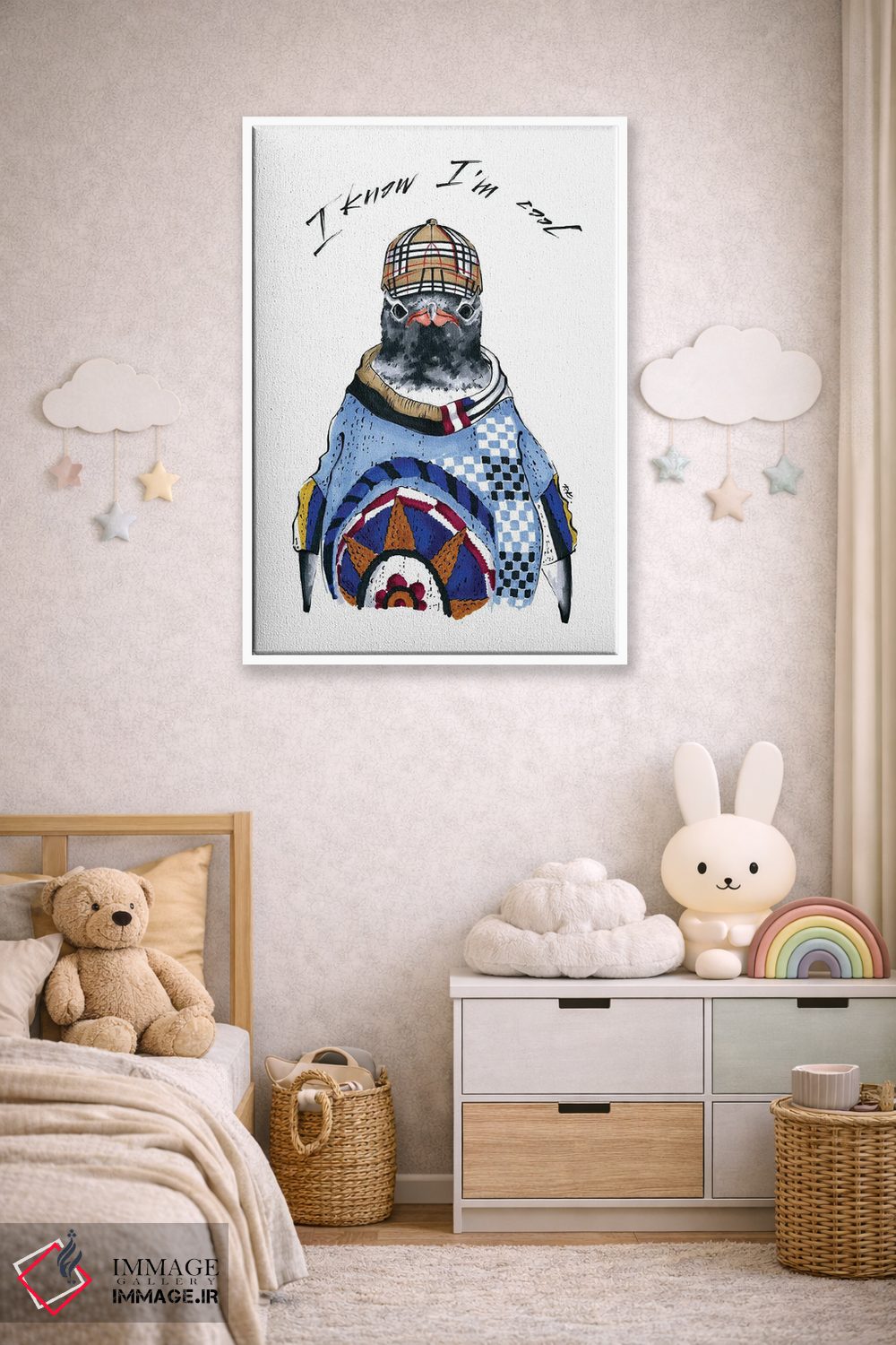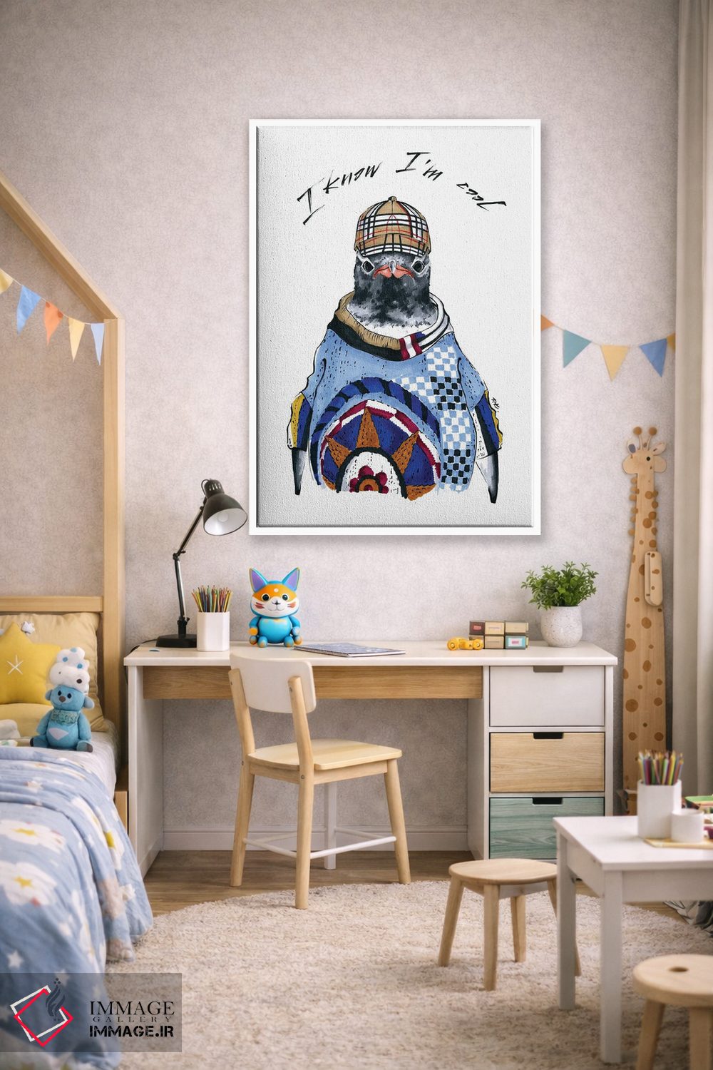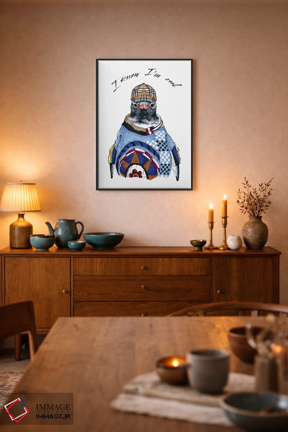 اگر میخواهید دیوار کمی سرزندگیِ محترمانه داشته باشد، «پنگوئن» اثرِ «کاترینا پاشهگور» به فضا، گرمیِ ملایم اضافه میکند، برای کافههای کوچک و صمیمی گزینهٔ مناسبیست. برای دیوار گالریوار هم گزینهٔ خوبیست.