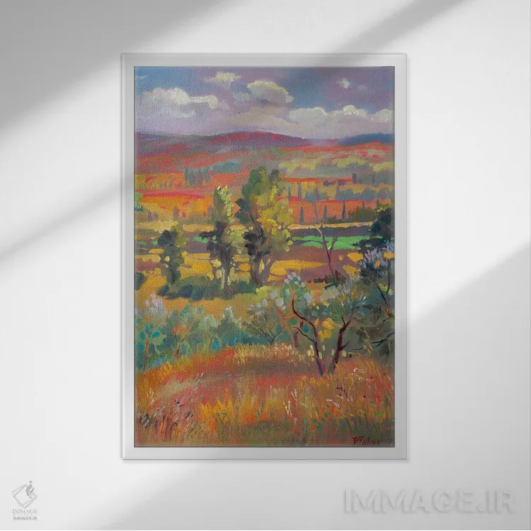 «تابستان در توسکانی» اثرِ «کاتارینا والِوا» یک قاب دکوراتیوِ گرم و دلنشین است؛ این اثر در اجرای پرداختِ هنری، فضا را نرمتر و صمیمیتر نشان میدهد.