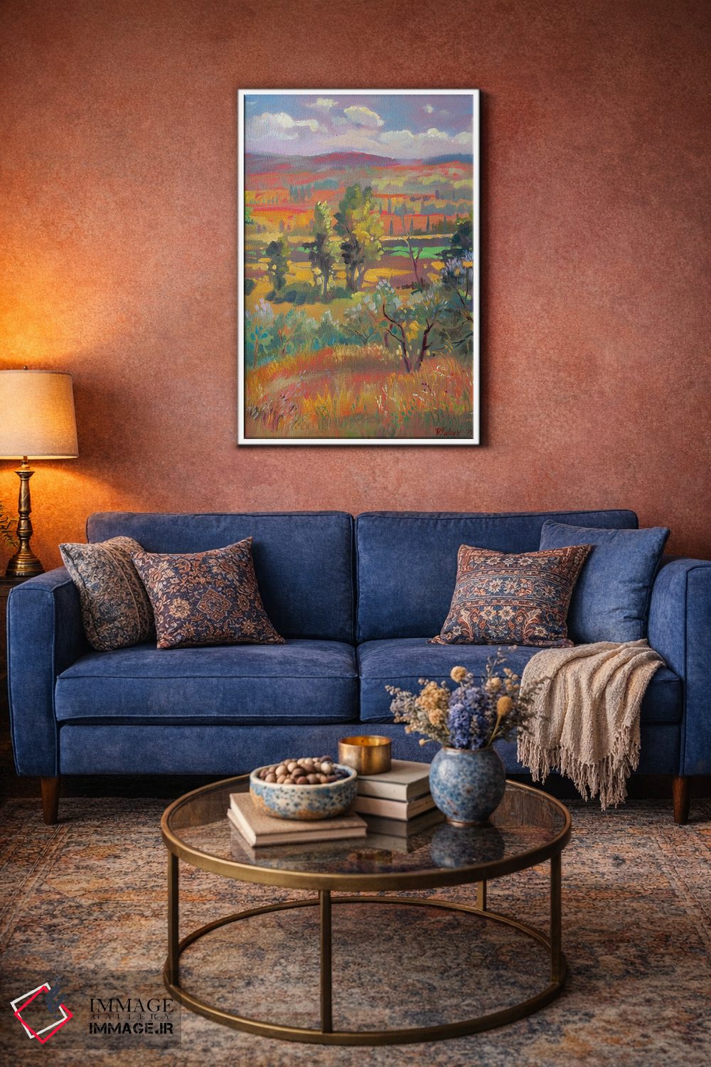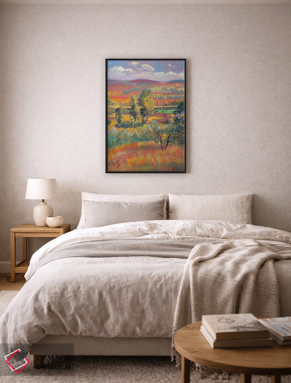 براساس پالت گرم اثر، قاب تیک گرم (چوبی) پیشنهاد اول است و مشکی مات (فریم متوسط) مکمل. برای سفارشهای پروژهای با ابعاد و قابهای اختصاصی با ایماژ در تماس باشید.
