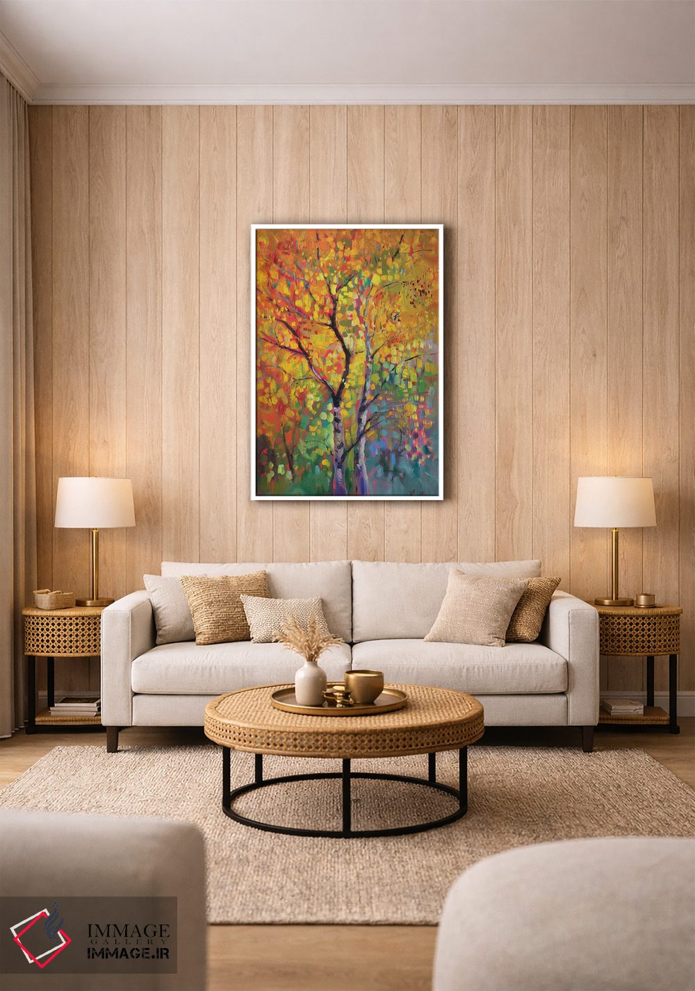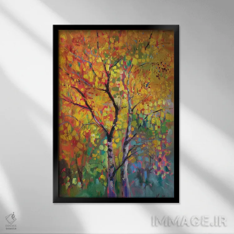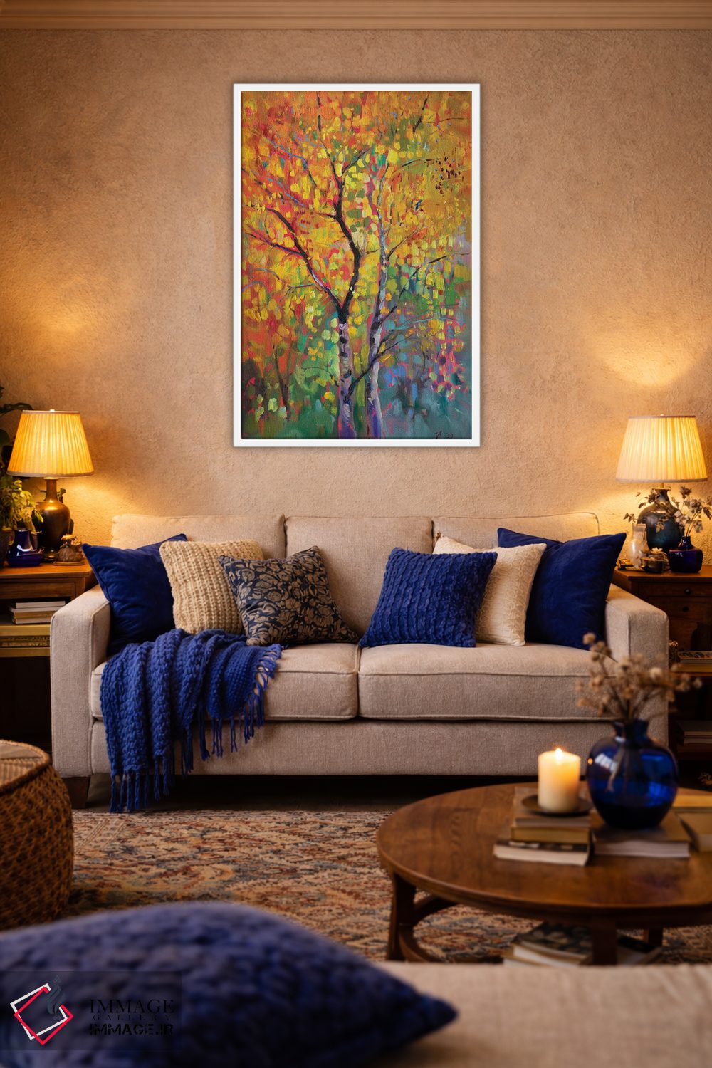 براساس پالت ترکیبی اثر، قاب تیک گرم (چوبی) پیشنهاد اول است و مشکی مات (فریم متوسط) مکمل. برای سفارشهای پروژهای با ابعاد و قابهای اختصاصی با ایماژ در تماس باشید.