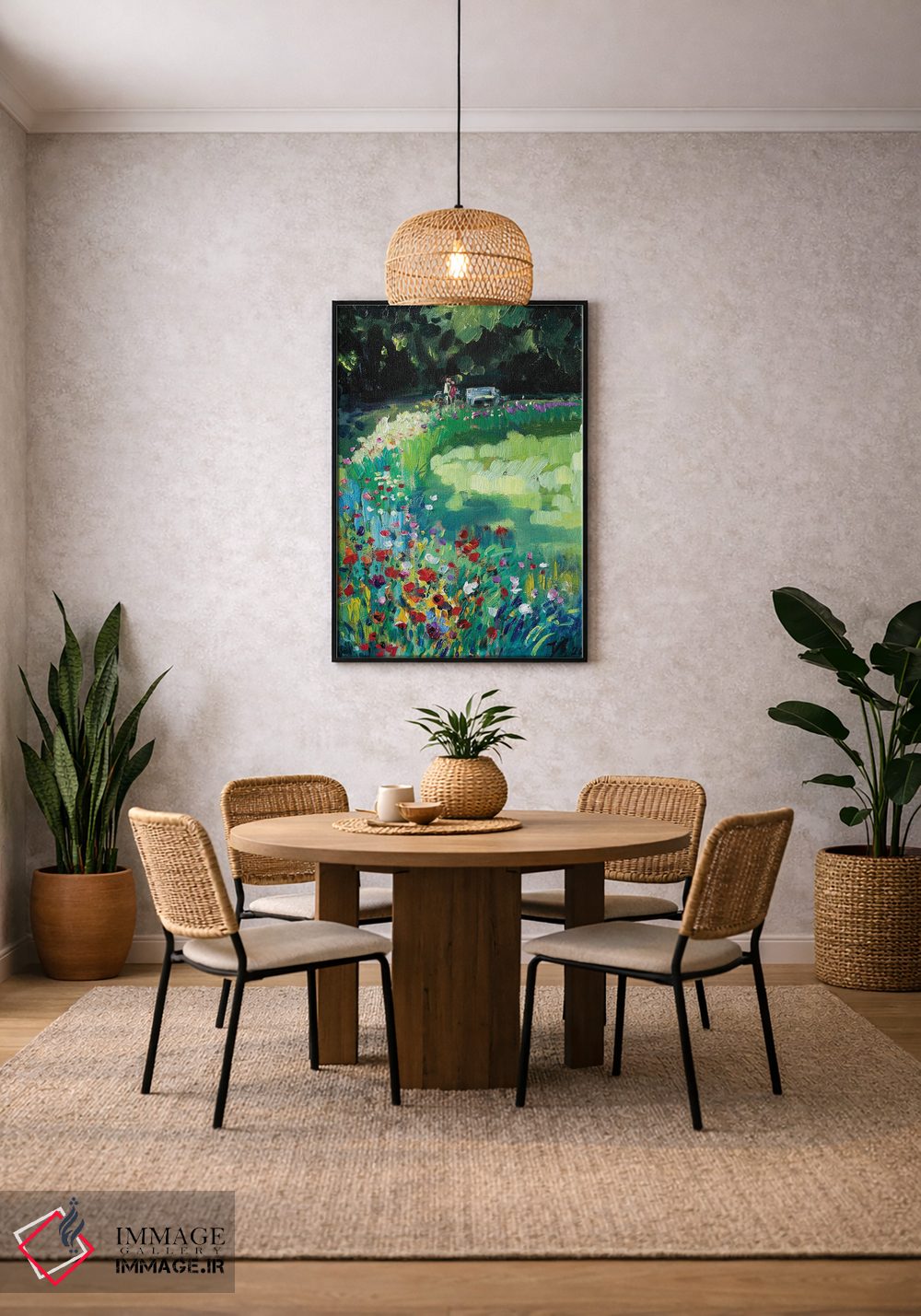 براساس پالت ترکیبی اثر، قاب تیک گرم (چوبی) پیشنهاد اول است و مشکی مات (فریم متوسط) مکمل. برای سفارشهای پروژهای با ابعاد و قابهای اختصاصی با ایماژ در تماس باشید.