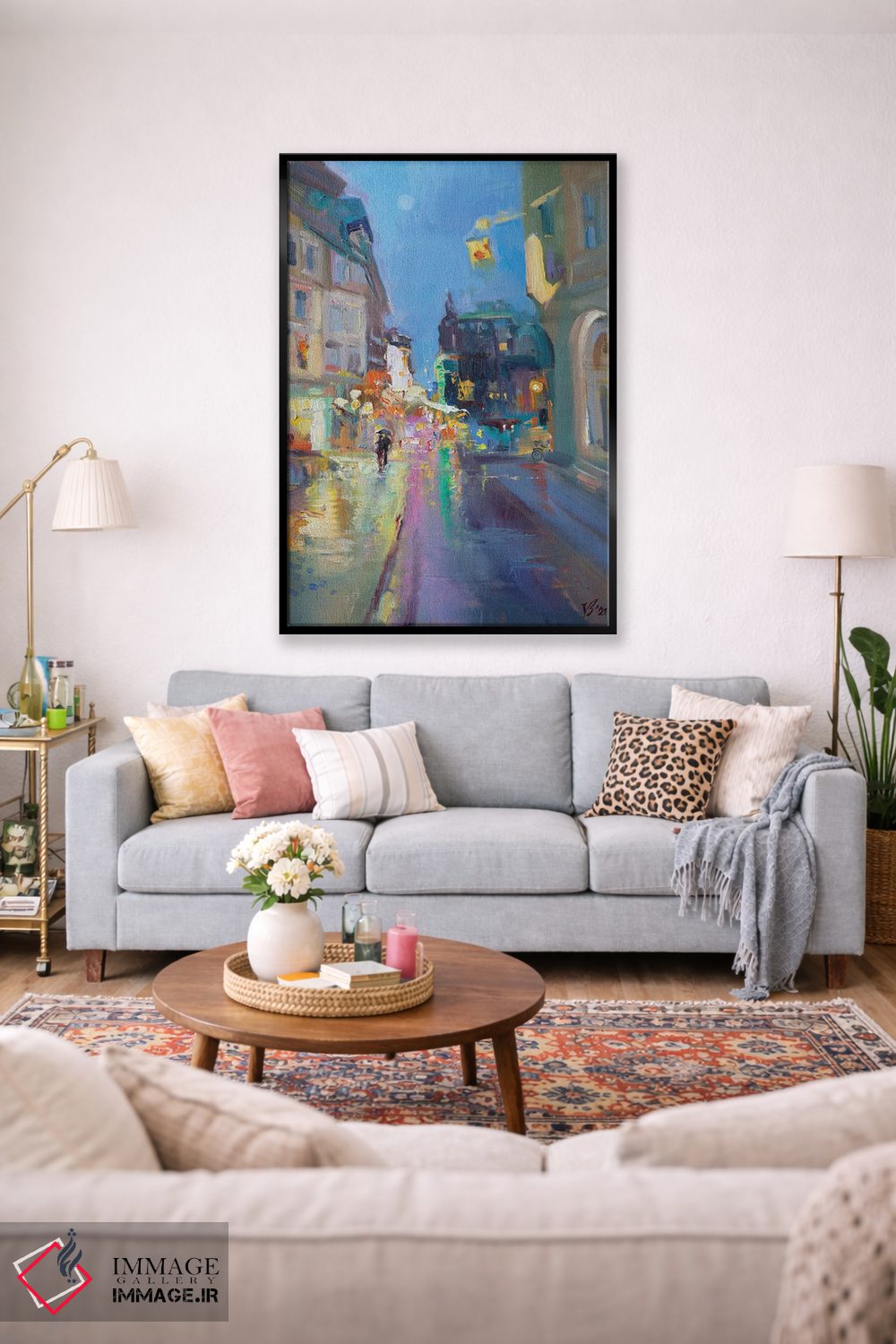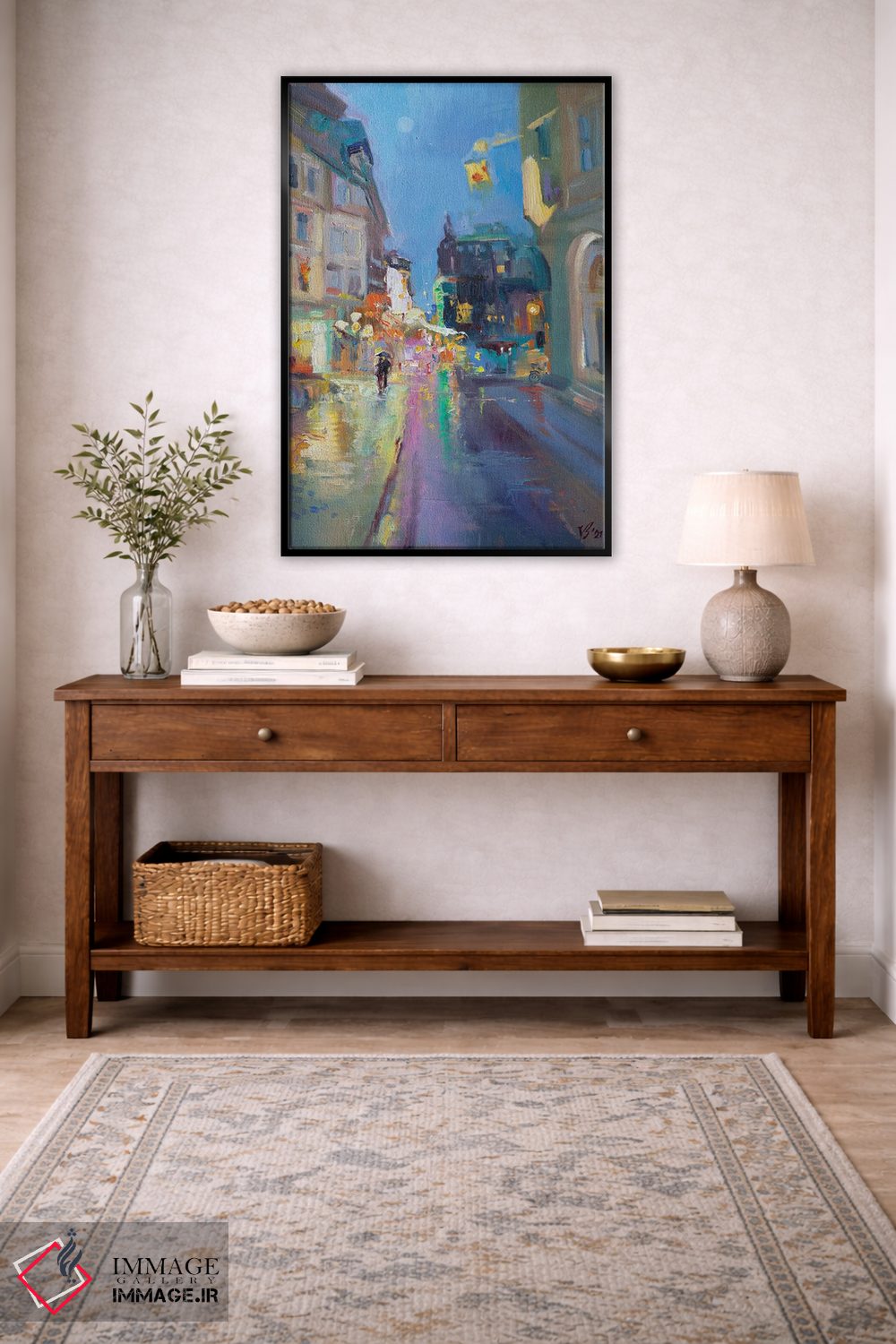 برای ترکیب با گلدانهای سبز، پارچههای ساده و نور گرم، «غروب بارانی» اثرِ «کاتارینا والِوا» با موضوعِ این اثر انتخابی هماهنگ است.