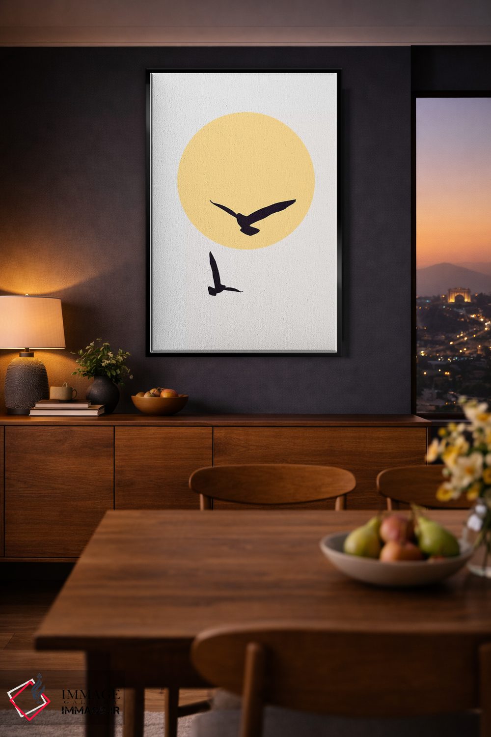 براساس پالت گرم اثر، قاب تیک گرم (چوبی) پیشنهاد اول است و مشکی مات (فریم متوسط) مکمل. برای سفارشهای پروژهای با ابعاد و قابهای اختصاصی با ایماژ در تماس باشید.