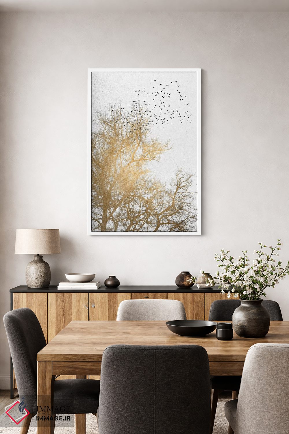 براساس پالت گرم اثر، قاب بلوط روشن (چوبی) پیشنهاد اول است و استخوانی ملایم مکمل. برای سفارشهای پروژهای با ابعاد و قابهای اختصاصی با ایماژ در تماس باشید.