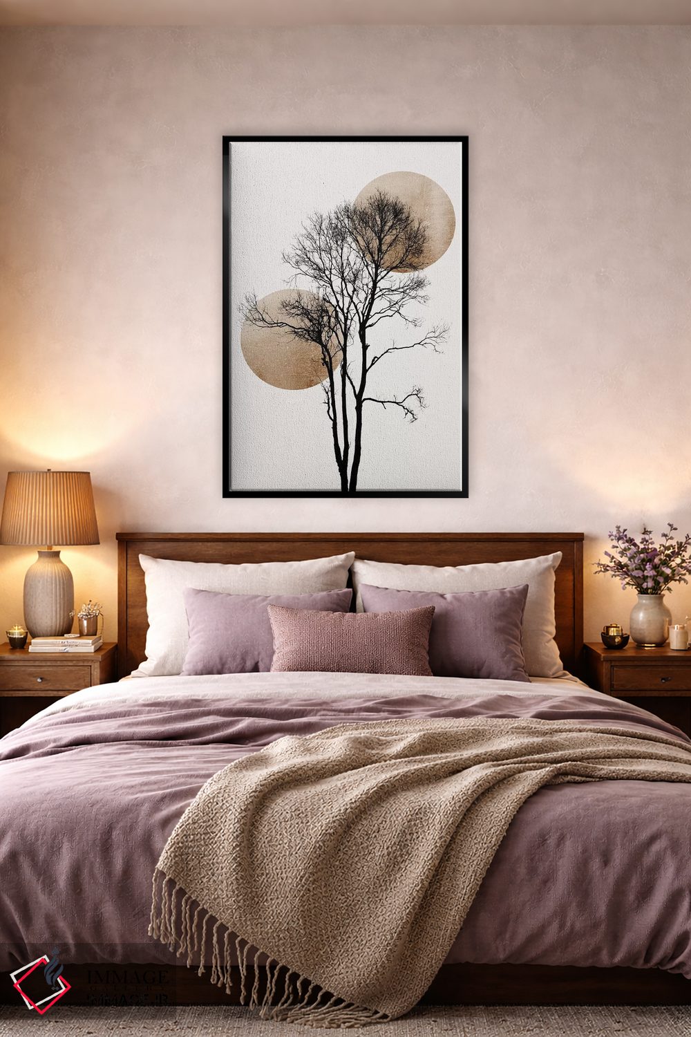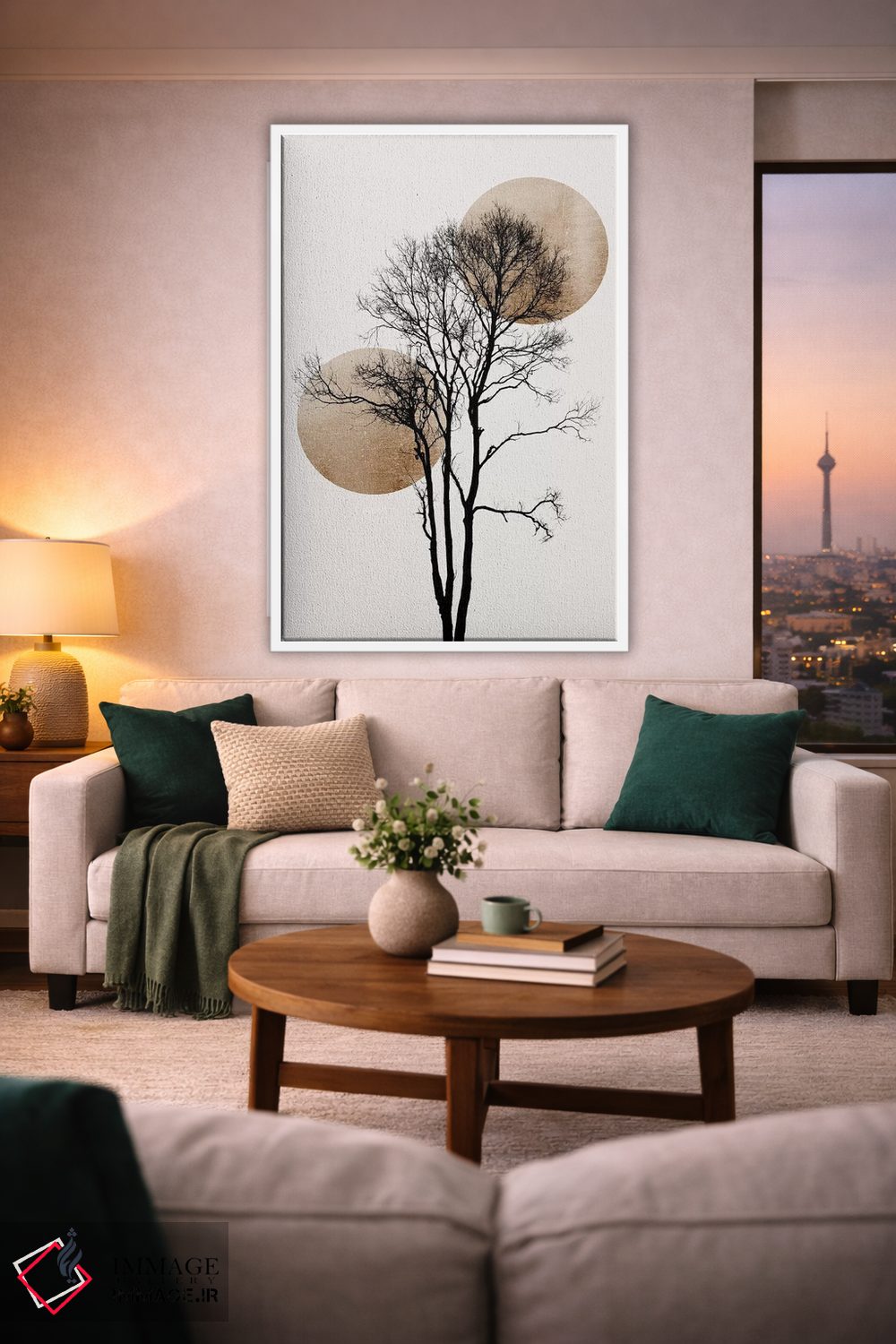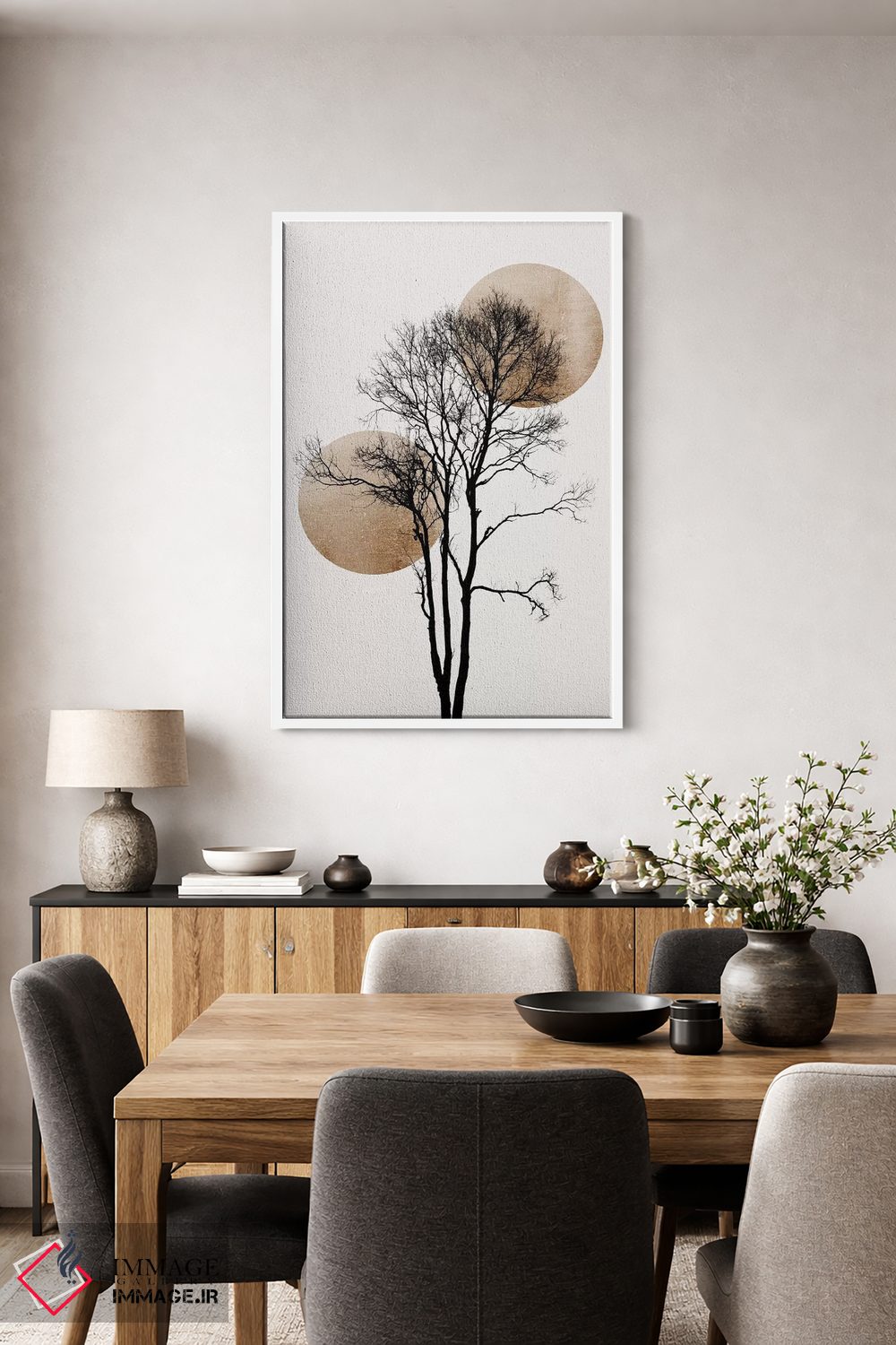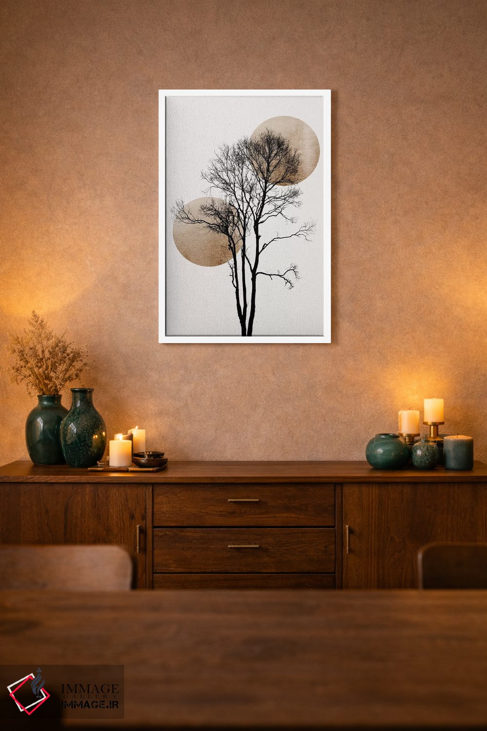 تابلو مینیمال خورشید و ماه پنهان - طلایی اثر کوبیستیکا - نمای قاب‌دار سفید