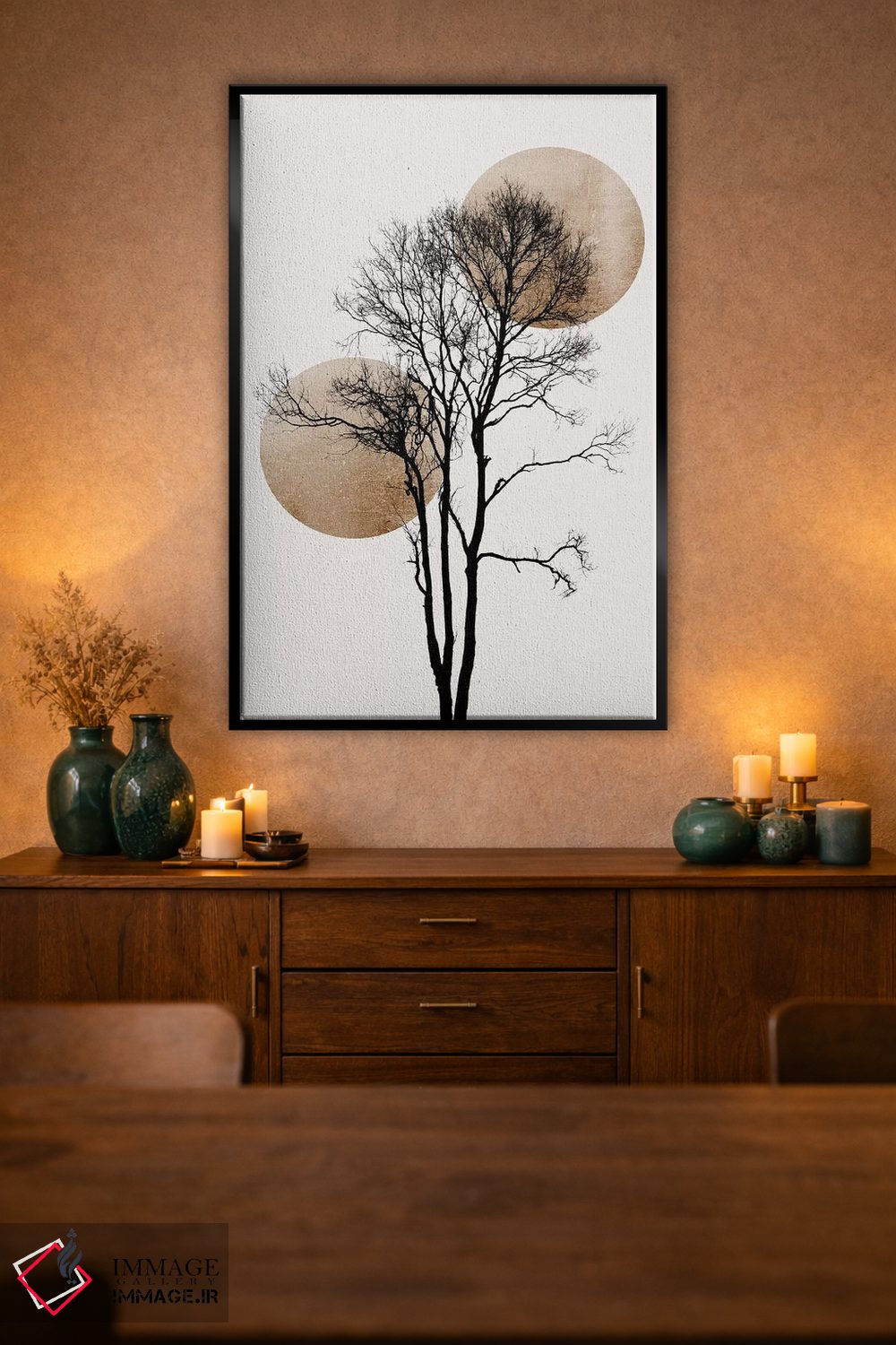 تابلو مینیمال خورشید و ماه پنهان - طلایی اثر کوبیستیکا - نمای قاب‌دار مشکی