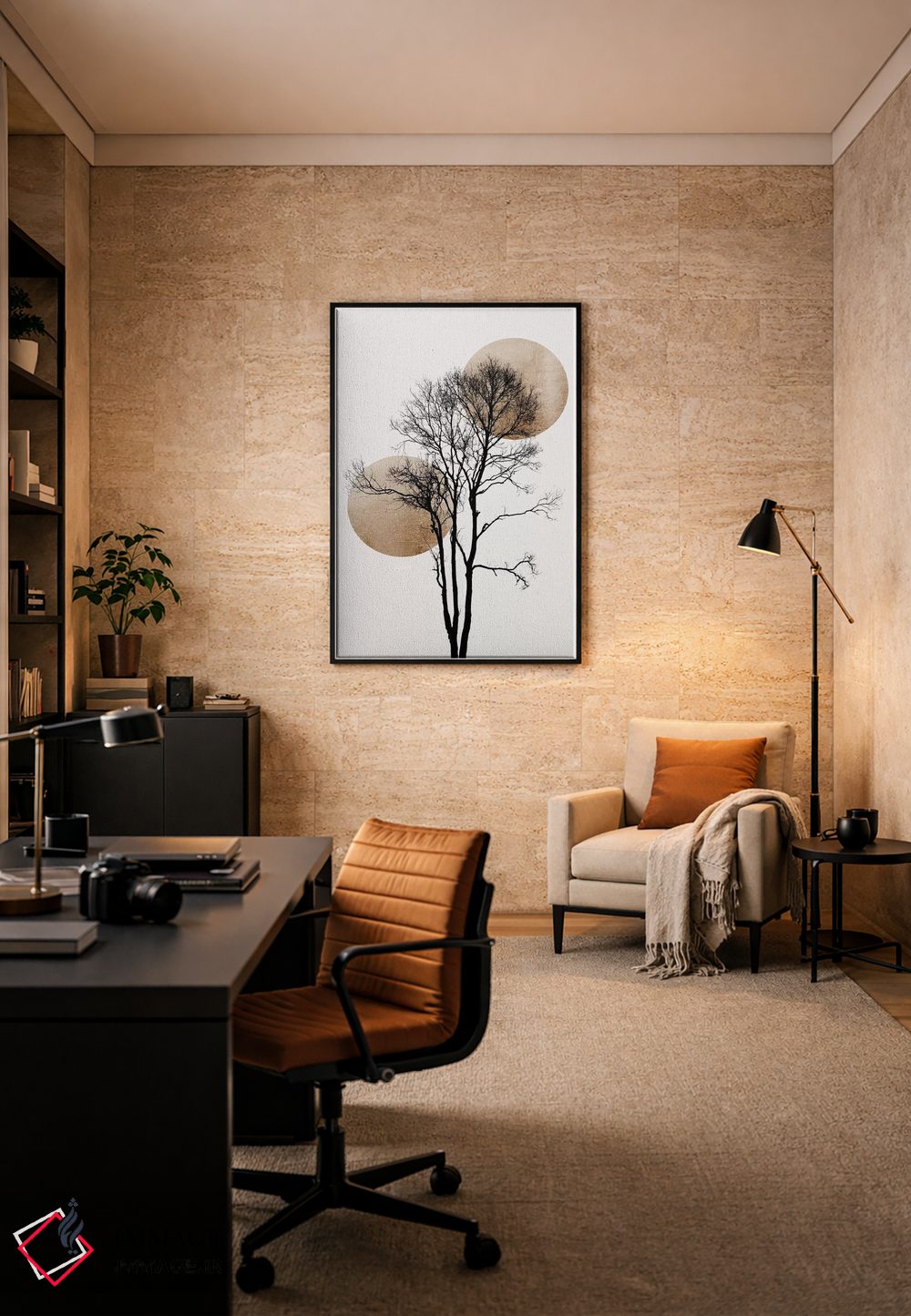 تابلو مینیمال خورشید و ماه پنهان - طلایی اثر کوبیستیکا - نمای روبه‌رو روی دیوار