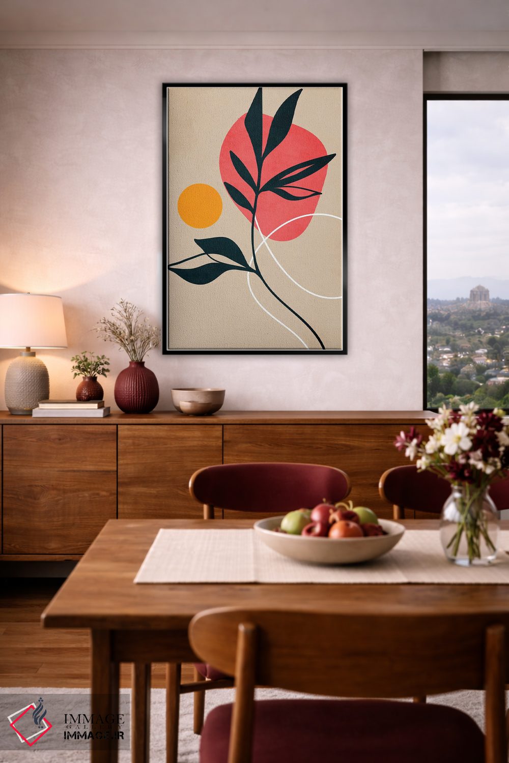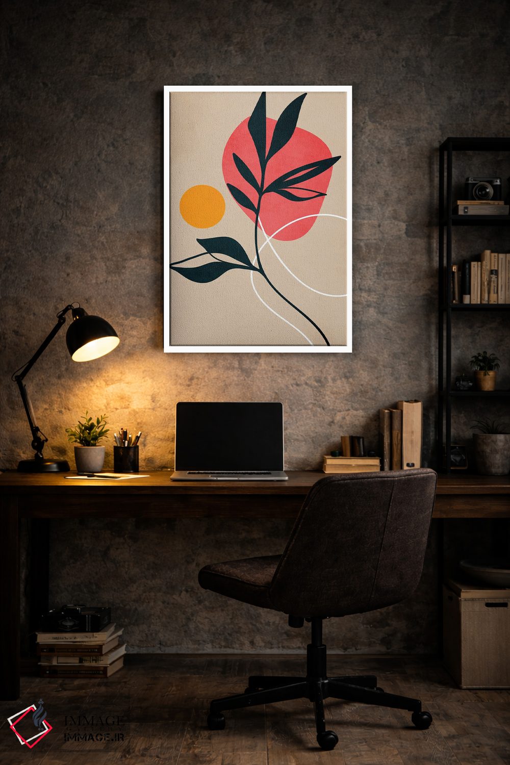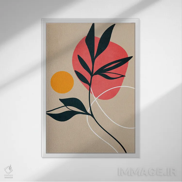 براساس پالت گرم اثر، قاب بلوط روشن (چوبی) پیشنهاد اول است و استخوانی ملایم مکمل. برای سفارشهای پروژهای با ابعاد و قابهای اختصاصی با ایماژ در تماس باشید.