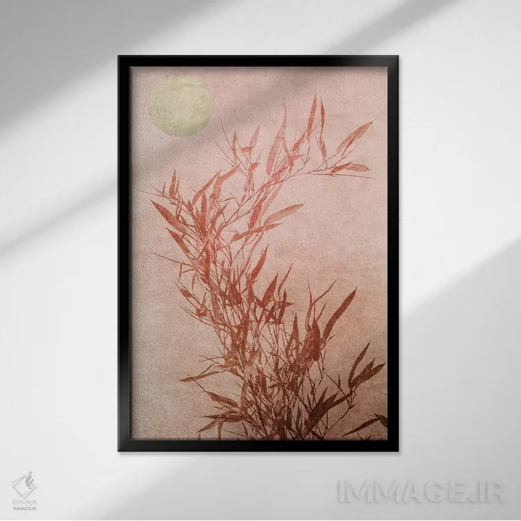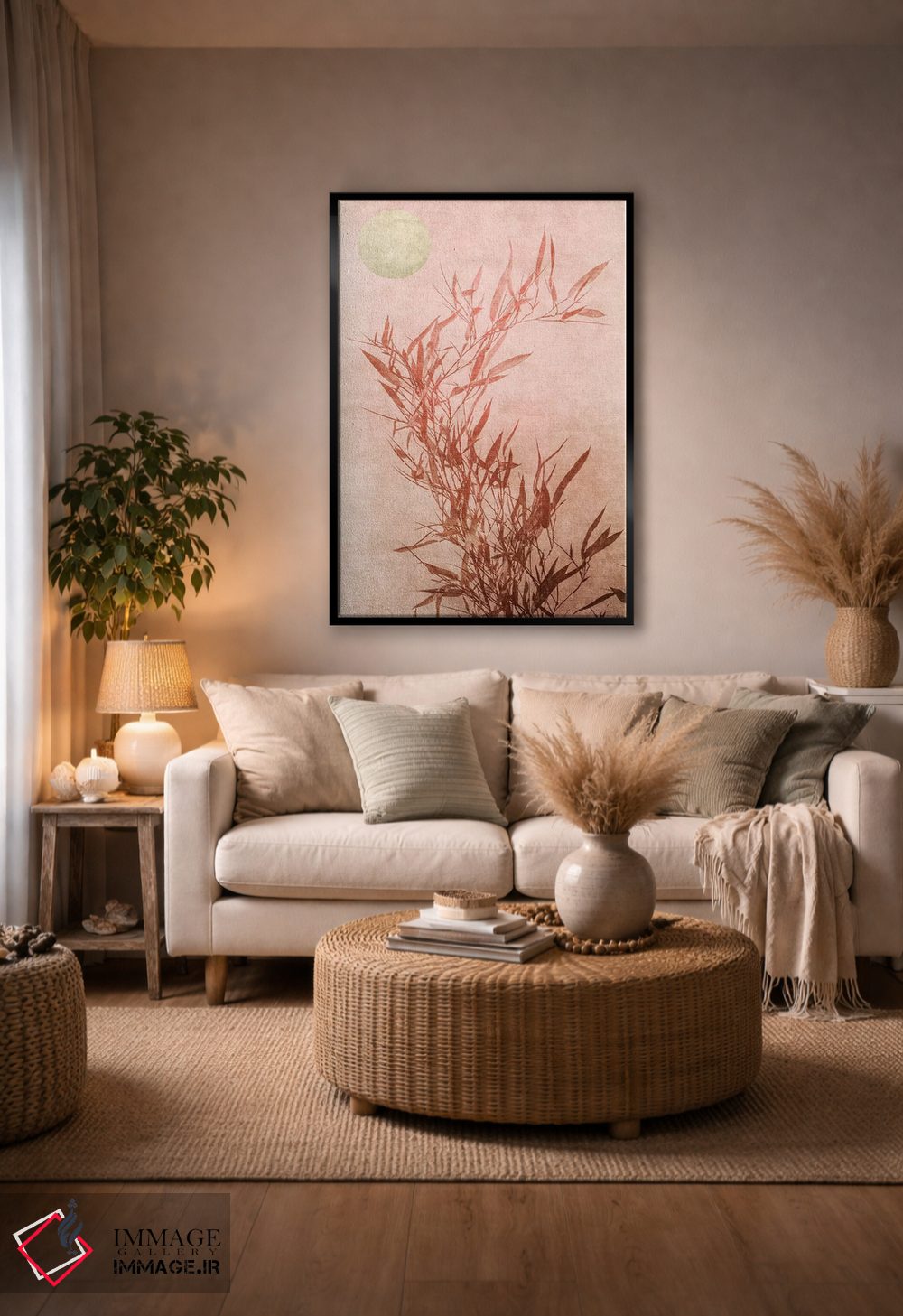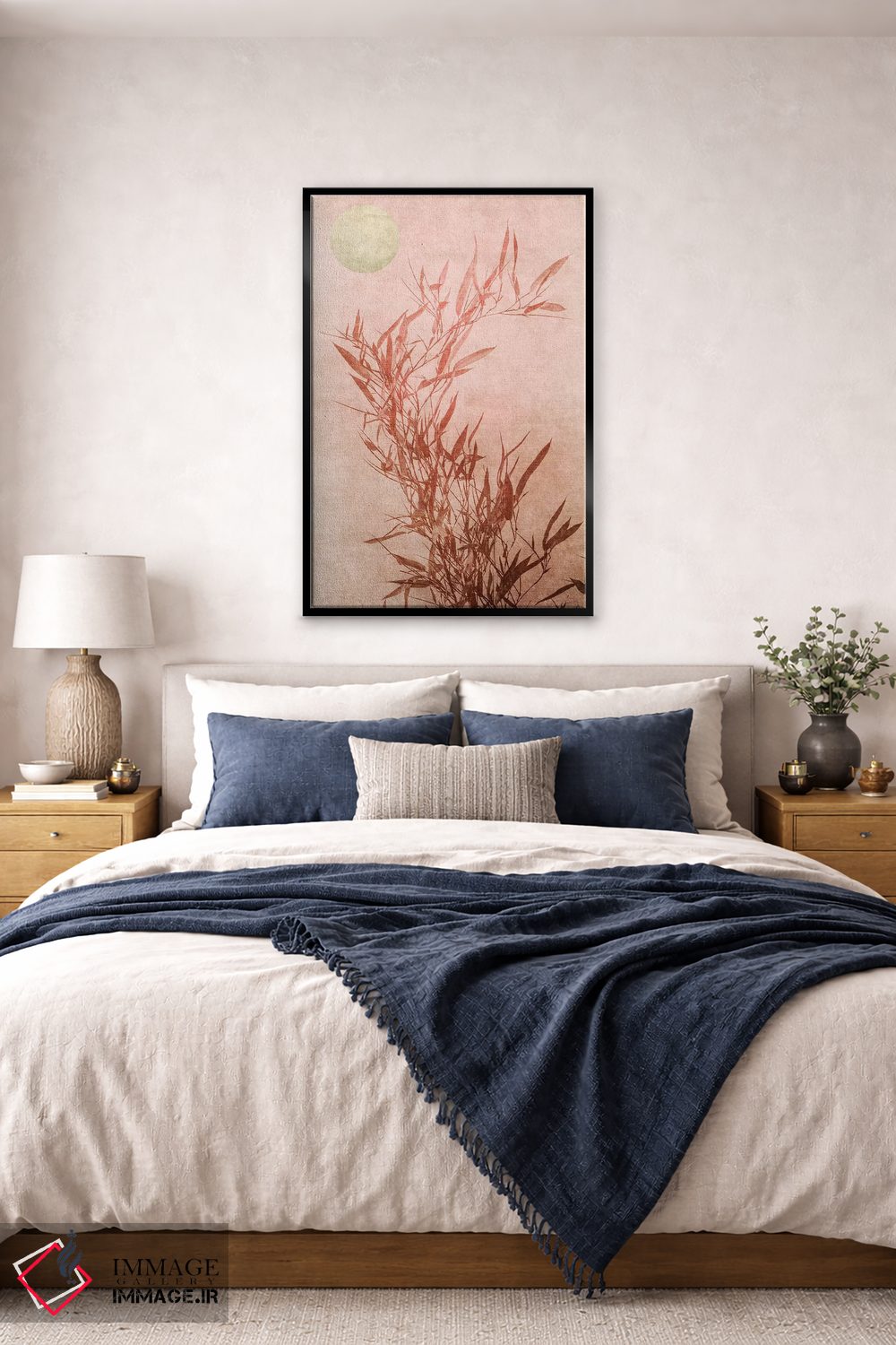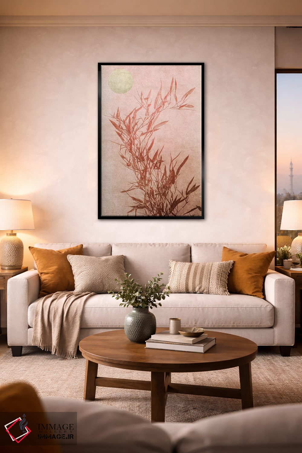 براساس پالت گرم اثر، قاب بلوط روشن (چوبی) پیشنهاد اول است و استخوانی ملایم مکمل. برای سفارشهای پروژهای با ابعاد و قابهای اختصاصی با ایماژ در تماس باشید.
