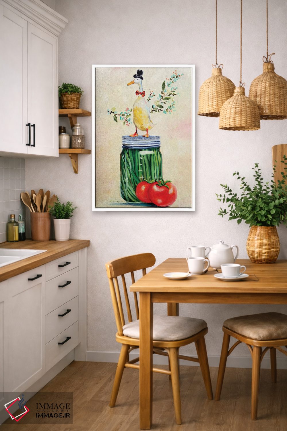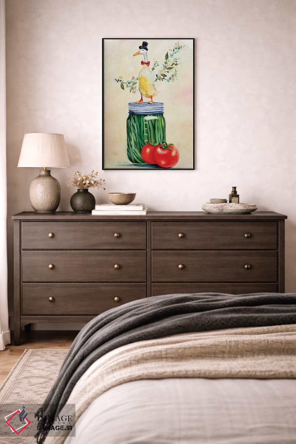 برای دکورهای صمیمی، «آقای پیکل شگفتانگیز» اثرِ «کارن وبر» به دیوار، انرژیِ نرم و زنده میدهد؛ برای دکورهایی با رنگهای خنثی انتخابی خوشسلیقه است. هم فضا را گرم میکند، هم شلوغش نمیکند.