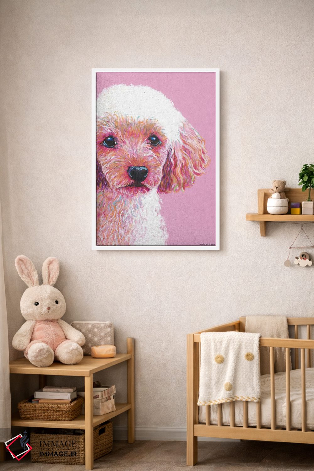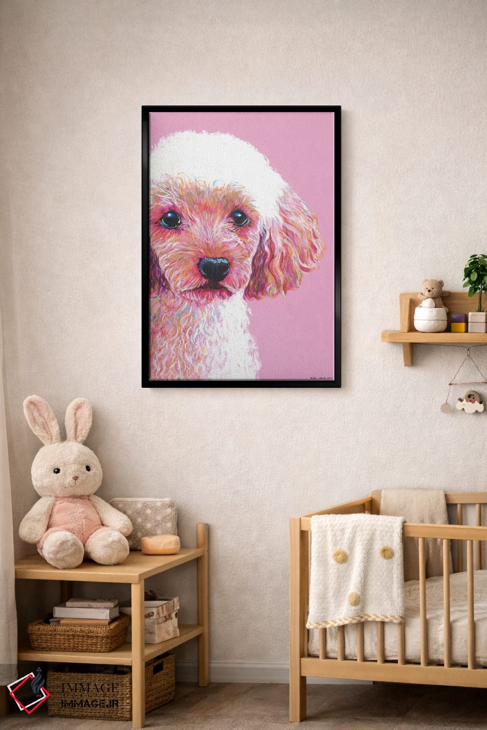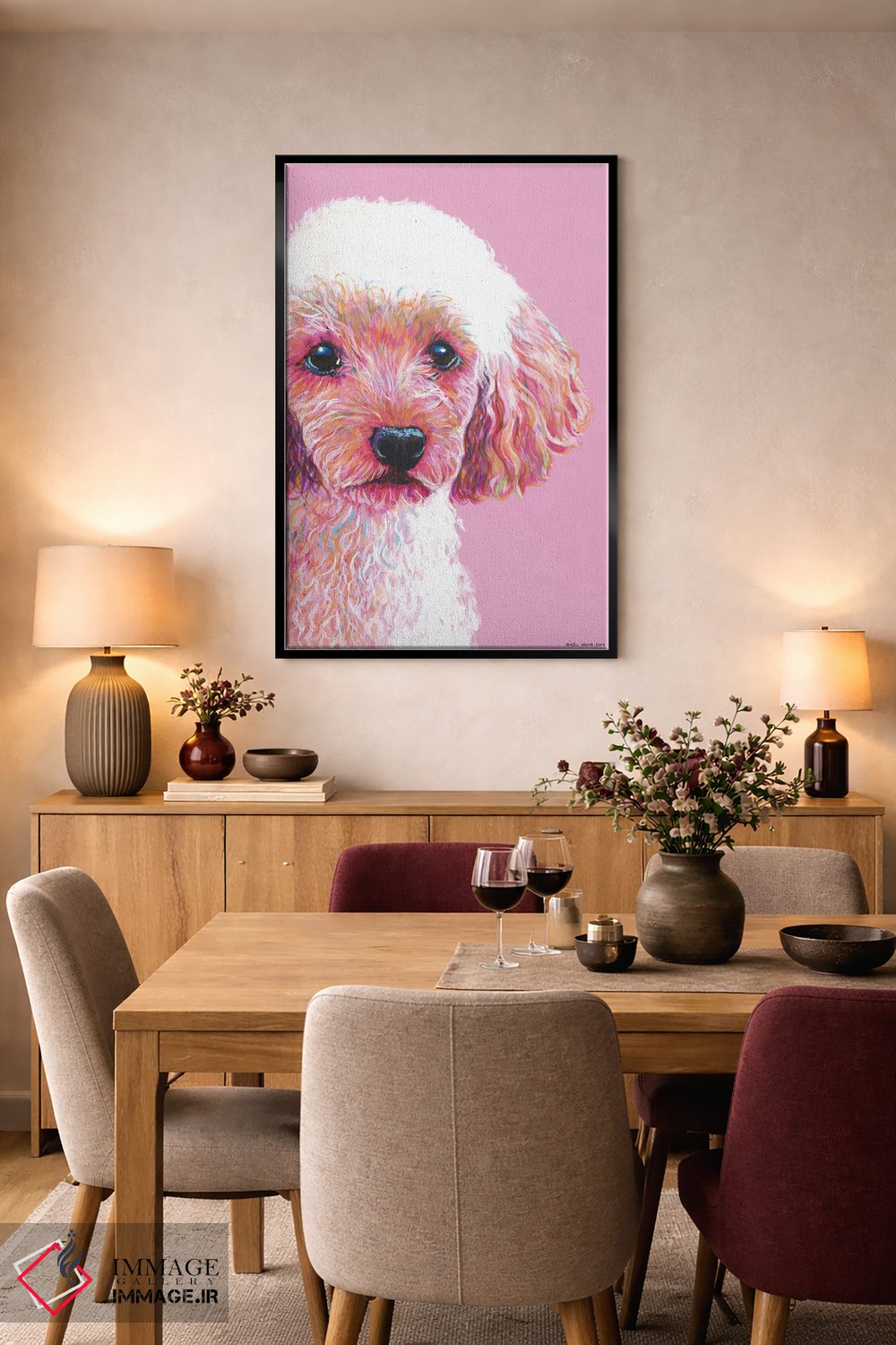 برای دیوارهای ساده، «پودل روی زمینه صورتی (سگ پودل)» اثرِ «کیرستین وود» در کنار رنگهای خنثی، تضاد دلچسبی میسازد؛ برای دکورهایی با رنگهای خنثی انتخابی خوشسلیقه است. با نورپردازی نقطهای، جذابتر هم میشود.