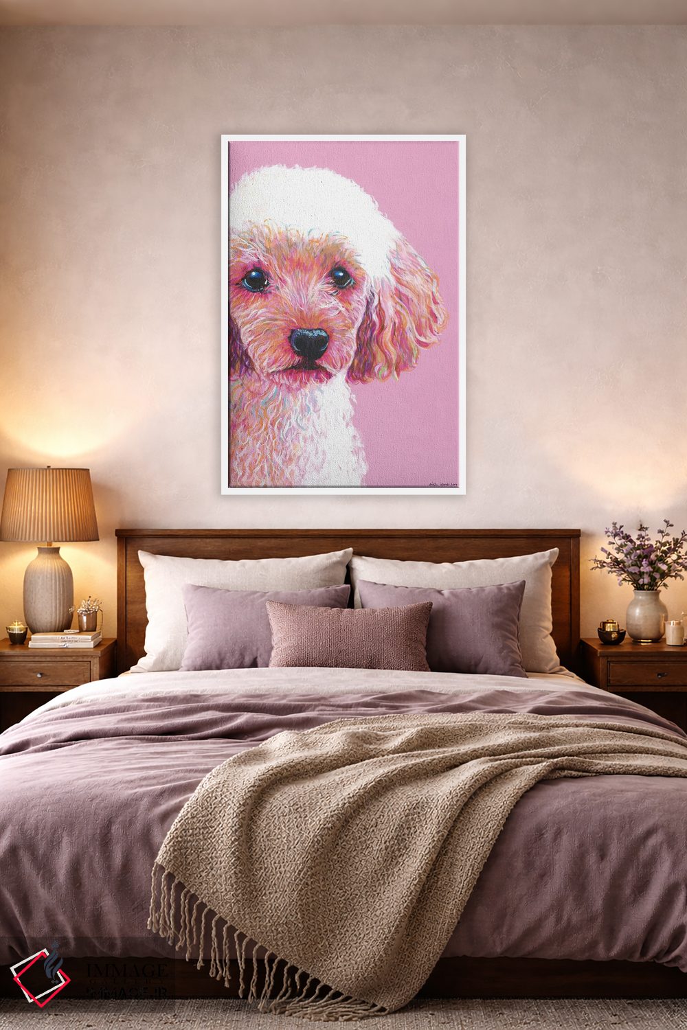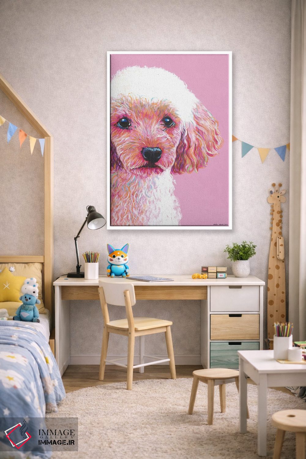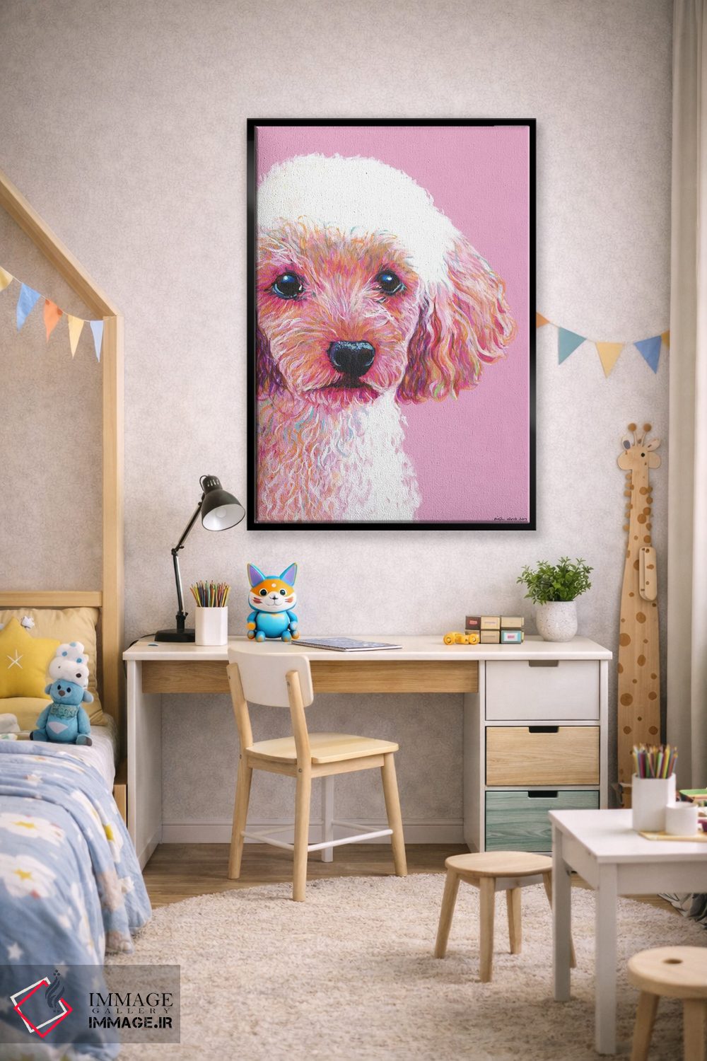 برای دیوارهای ساده، «پودل روی زمینه صورتی (سگ پودل)» اثرِ «کیرستین وود» در کنار رنگهای خنثی، تضاد دلچسبی میسازد؛ برای دکورهایی با رنگهای خنثی انتخابی خوشسلیقه است. با نورپردازی نقطهای، جذابتر هم میشود.
