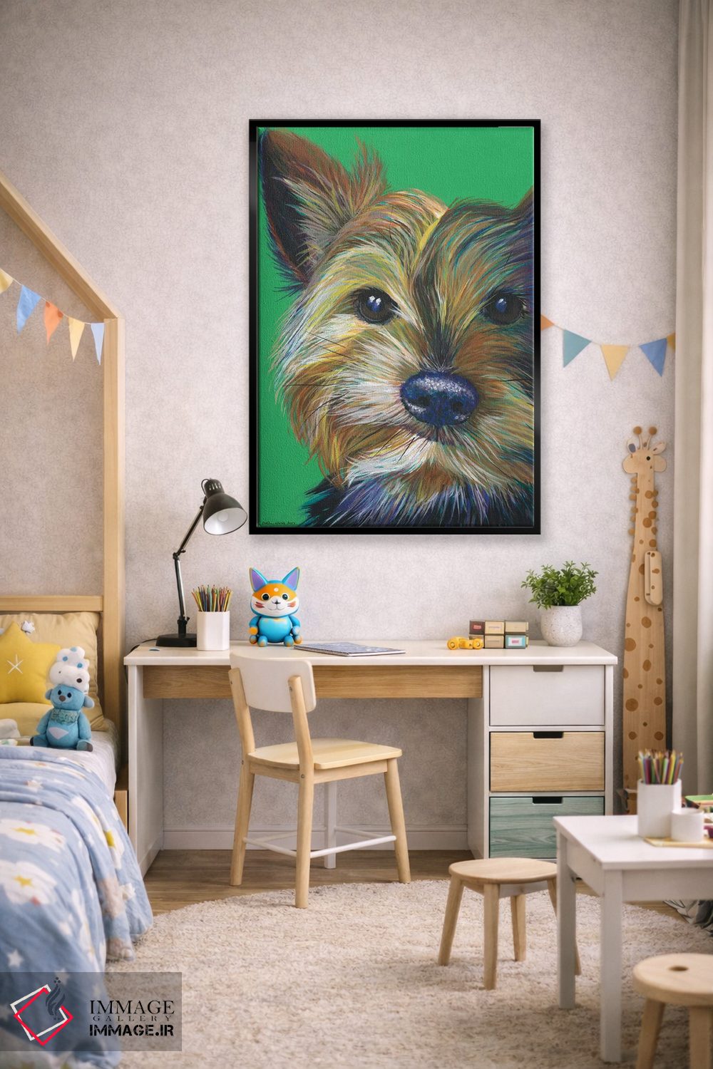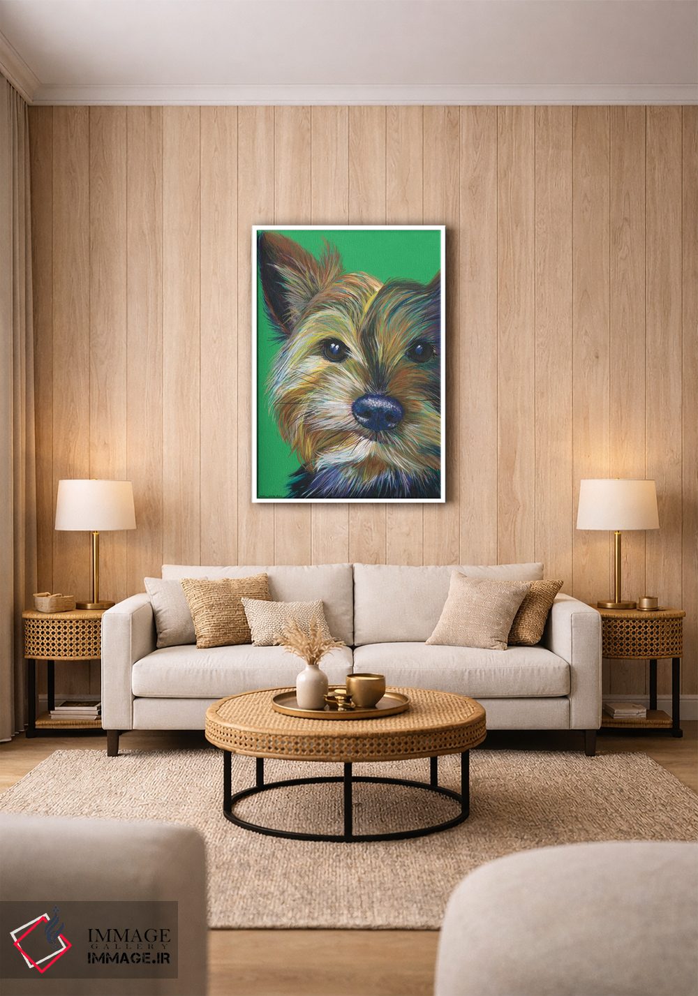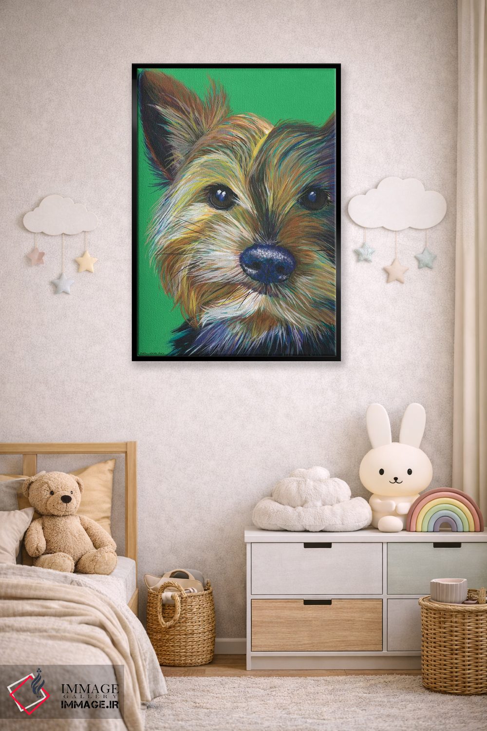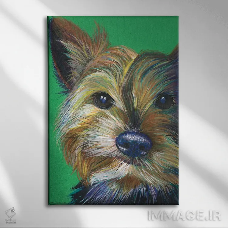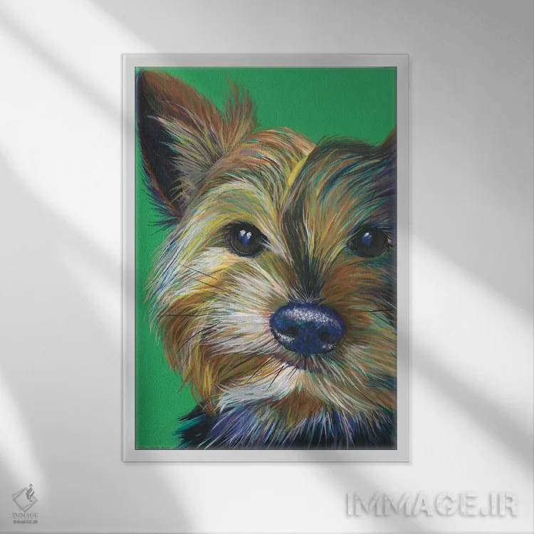 اگر به آثار حیوانات علاقه دارید، «یورکشایر تریر روی زمینه زمردی (سگ یورکشایر)» اثرِ «کیرستین وود» به دیوار، انرژیِ نرم و زنده میدهد، برای کافههای کوچک و صمیمی گزینهٔ مناسبیست. با نورپردازی نقطهای، جذابتر هم میشود.