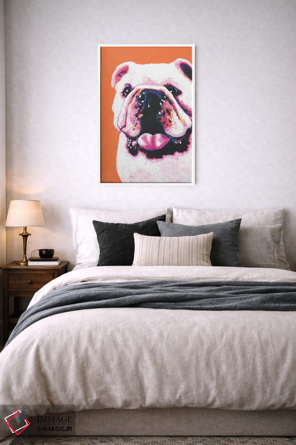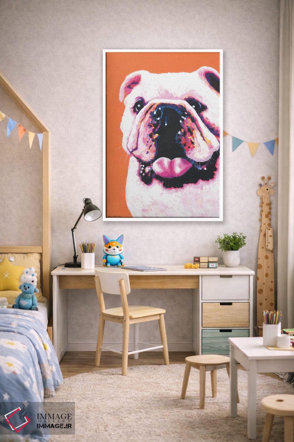 این اثر با عنوان «بولداگ روی زمینه نارنجی (سگ بولداگ)» اثرِ «کیرستین وود» مثل یک امضای بامزه اما متین عمل میکند؛ برای اتاق بازی یا گوشهٔ مطالعه انتخابی خوشسلیقه است. اگر دنبال اثر دوستداشتنیِ «بیغلو» هستید، این یکی دقیق مینشیند.