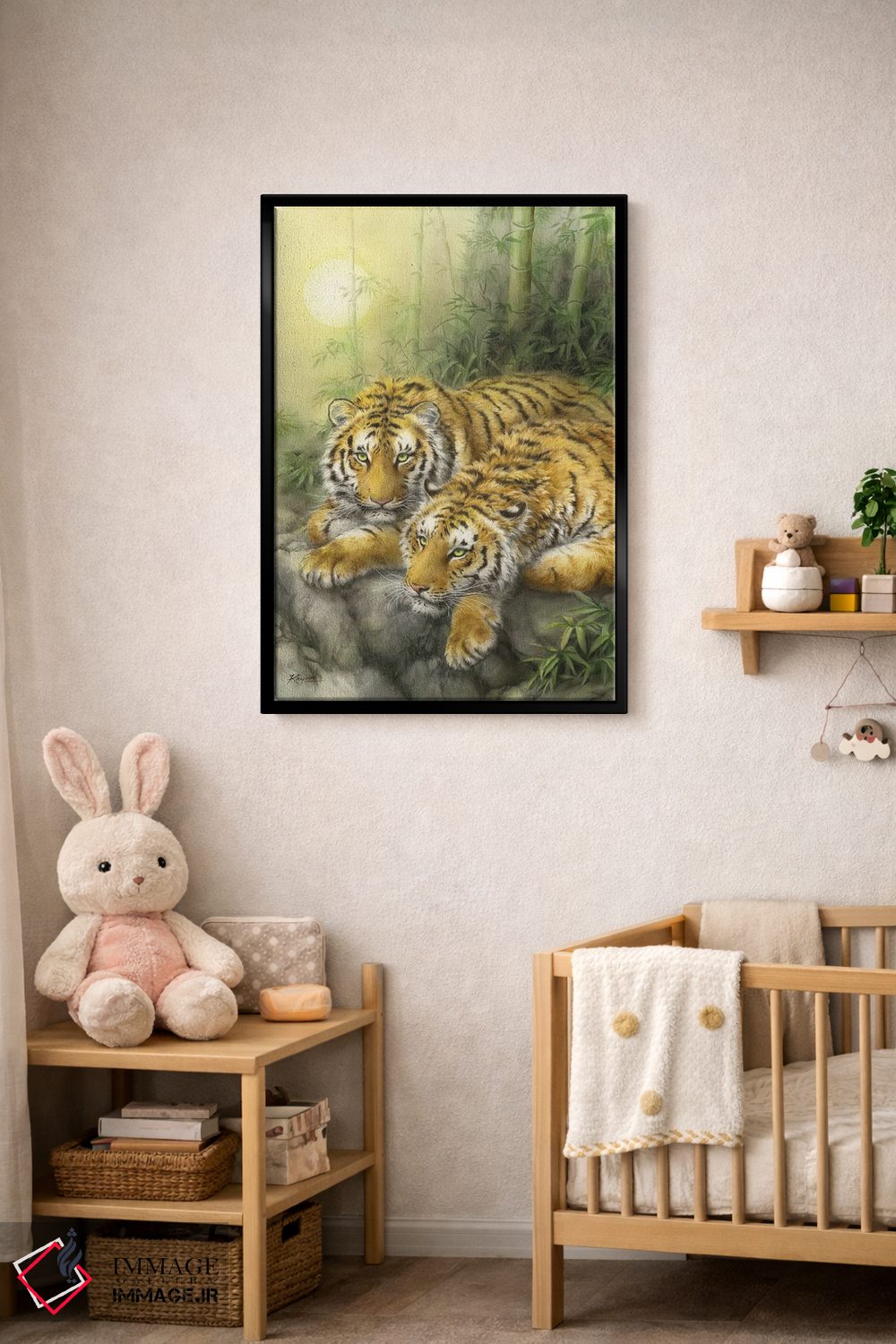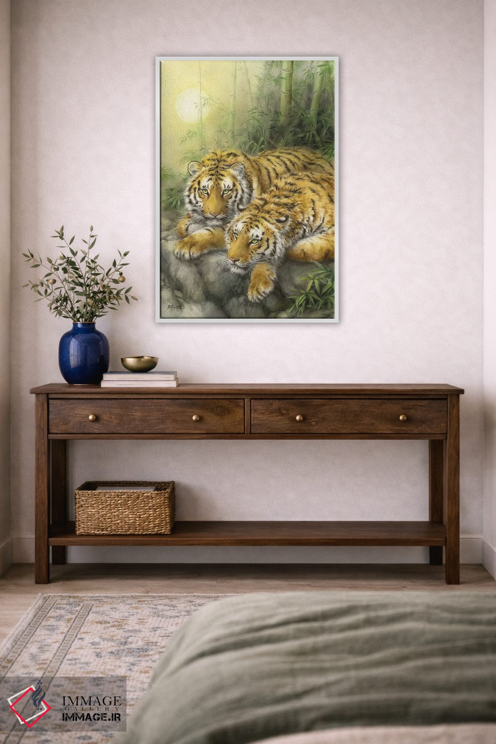 براساس پالت ترکیبی اثر، قاب بلوط روشن (چوبی) پیشنهاد اول است و استخوانی ملایم مکمل. برای سفارشهای پروژهای با ابعاد و قابهای اختصاصی با ایماژ در تماس باشید.