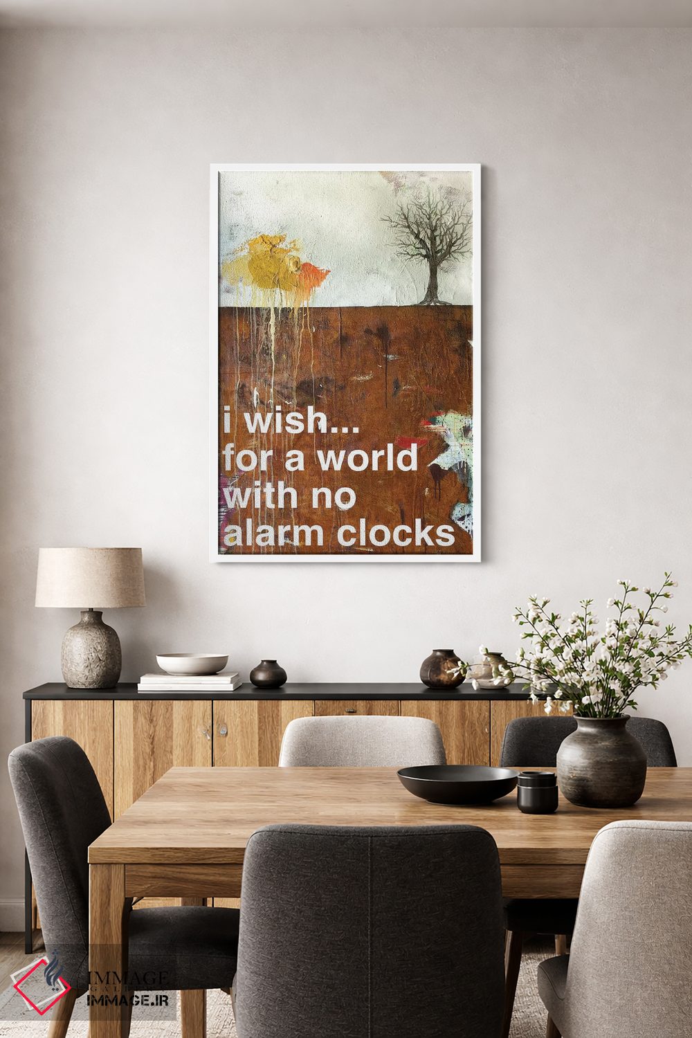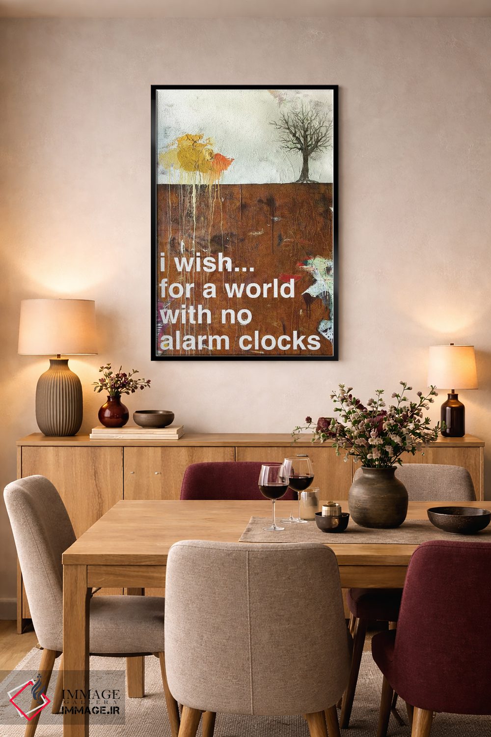 براساس پالت گرم اثر، قاب تیک گرم (چوبی) پیشنهاد اول است و مشکی مات (فریم متوسط) مکمل. برای سفارشهای پروژهای با ابعاد و قابهای اختصاصی با ایماژ در تماس باشید.