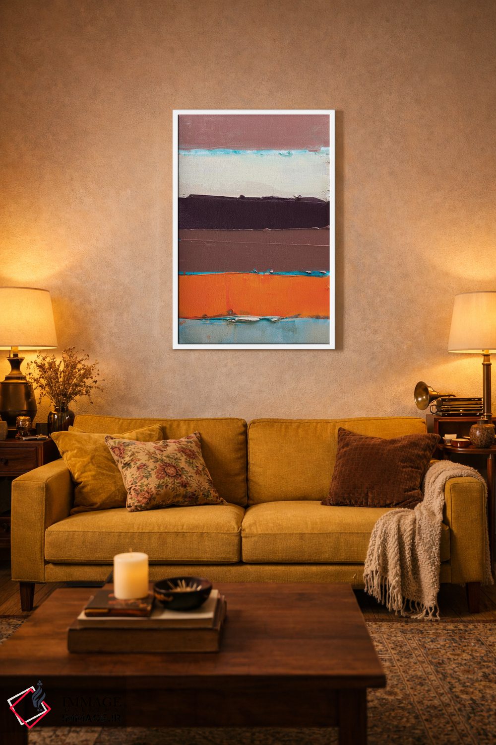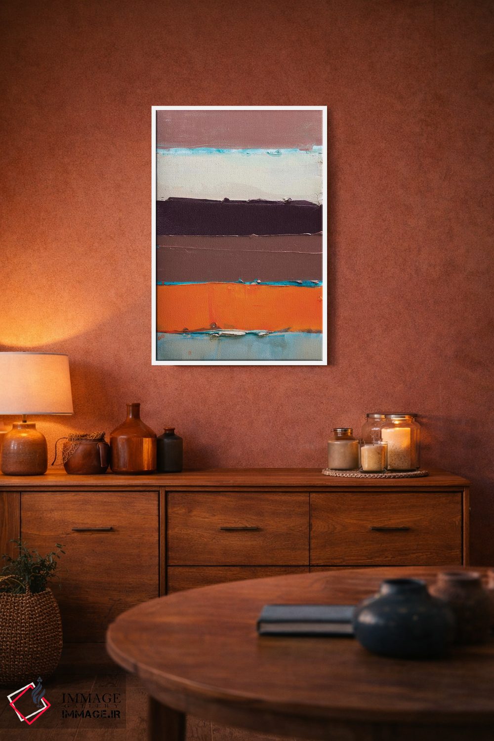 براساس پالت ترکیبی اثر، قاب تیک گرم (چوبی) پیشنهاد اول است و مشکی مات (فریم متوسط) مکمل. برای سفارشهای پروژهای با ابعاد و قابهای اختصاصی با ایماژ در تماس باشید.