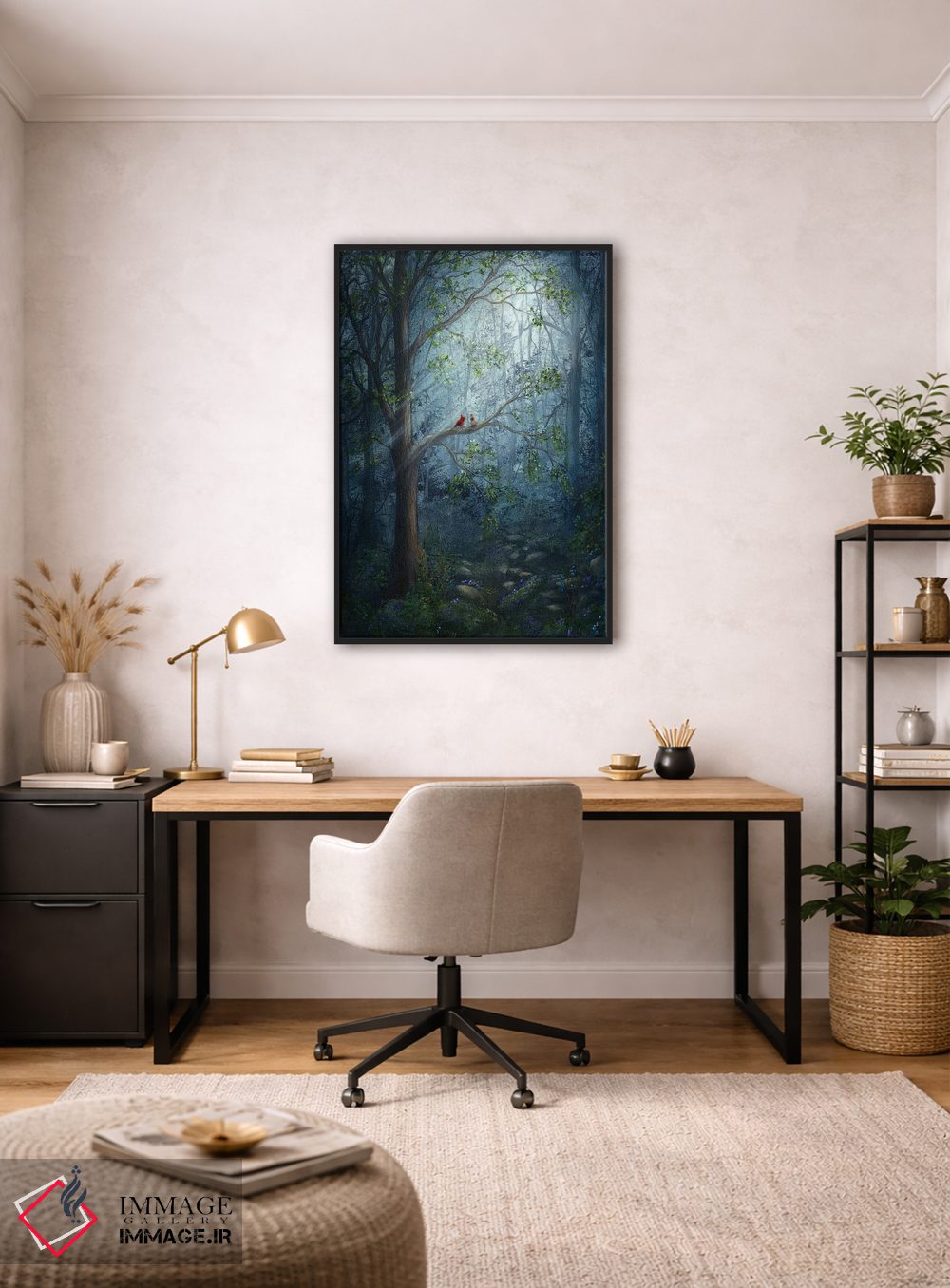 طراحی بوم گالری ایماژ بهگونهای است که اثر روی دیوار «پرداختشده» و حرفهای دیده شود—نه پرزرقوبرقِ بیپایه؛ بلکه دقیق و خوشپرداخت. بافت ظریف کنواس کمک میکند حس اثر هنری را در نگاه نزدیک نگه میدارد بهخصوص وقتی نور موضعی ملایم داشته باشید. چاپ جیکلی (Giclée) کمک میکند برای آرتپرینتهای جدی استاندارد رایج است و برای محیطهای رسمیتر هم انتخاب مطمئنی است. حاصل کار، یک تابلو خوشنشین است که هم از دور اثرگذار است و هم از نزدیک خوشخوان؛ در کنار نورپردازی درست، جلوهی گالریوار بیشتری حس میشود.